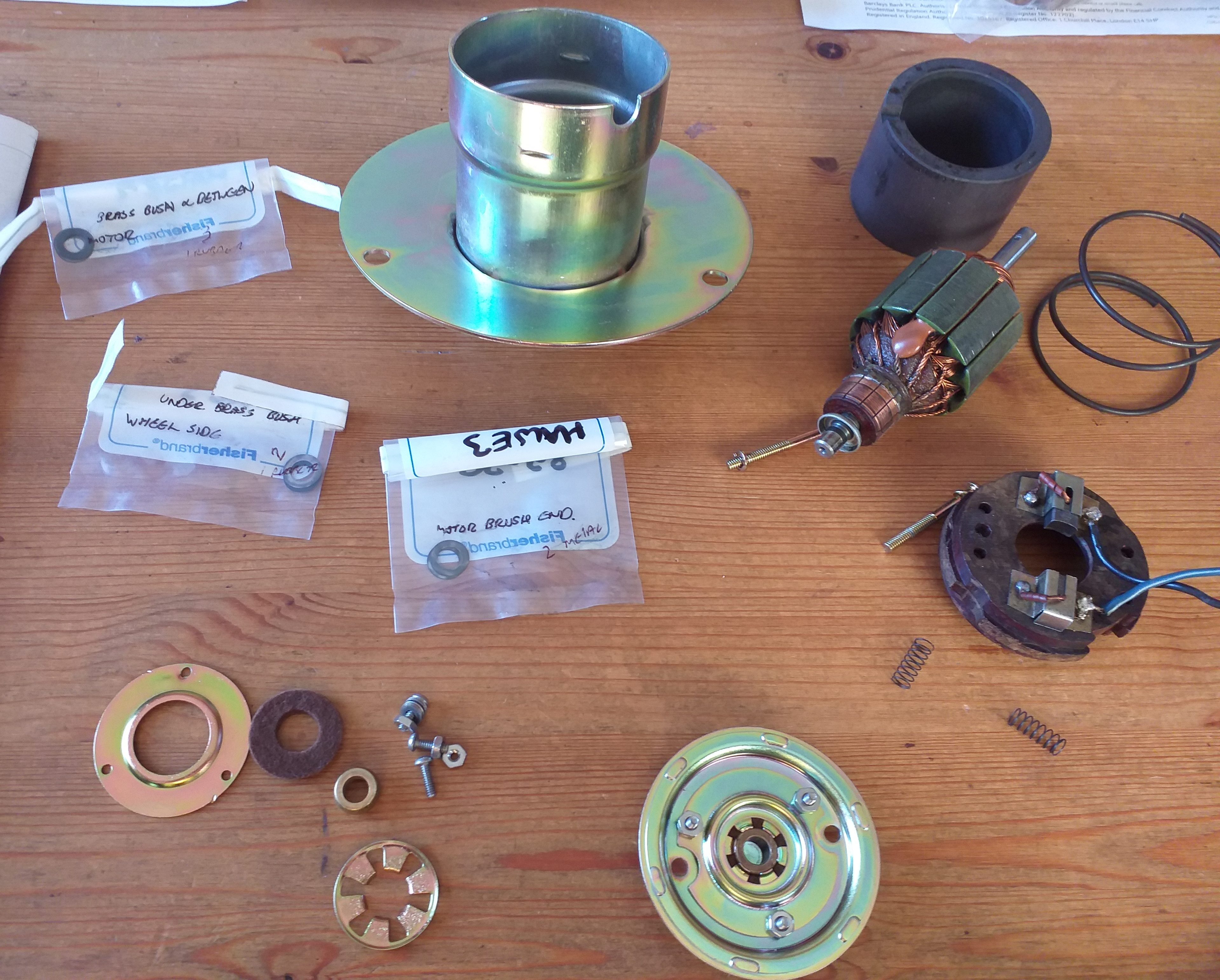 The heater motor has taken far too long to restore. Mainly because parts were lost at the plating business. I had to buy another secondhand motor to help complete the assembly. I made new brass bearings and felt washers. Here are some photos of the parts inside the motor and assembly.