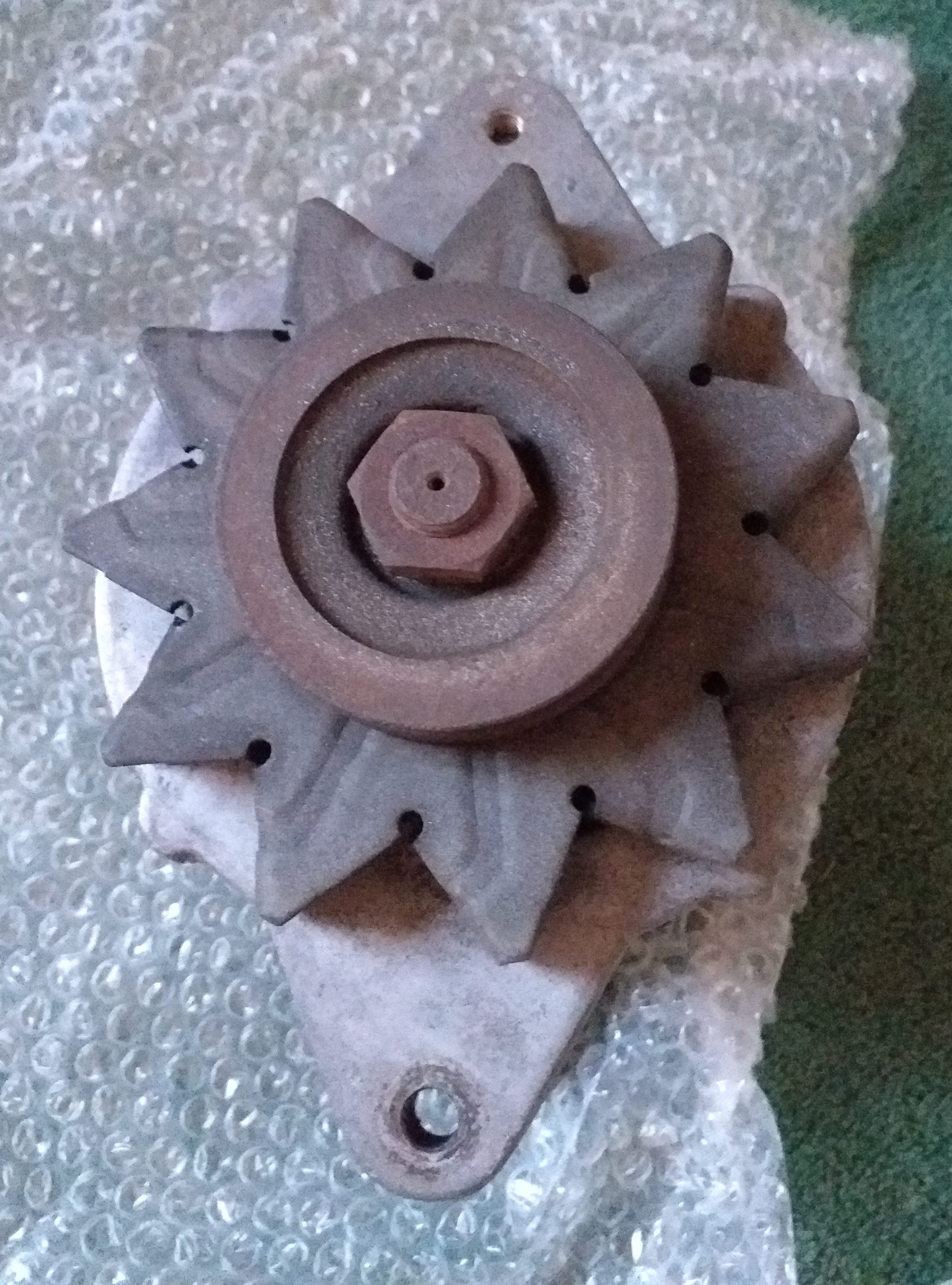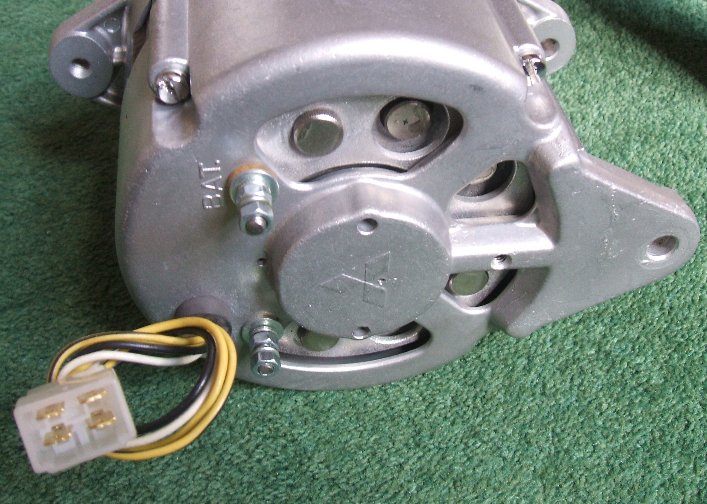 I brought this Mitsubishi alternator from Yahoo Japan. It may not be quite the correct model, but it is close. And it was only £6 (1000¥)! It has been completely rebuilt. The casings vapour blasted, parts yellow zinc plated and the internals rebuilt/replaced. New old stock wires (as per CSP wiring diagram) and new block connector.