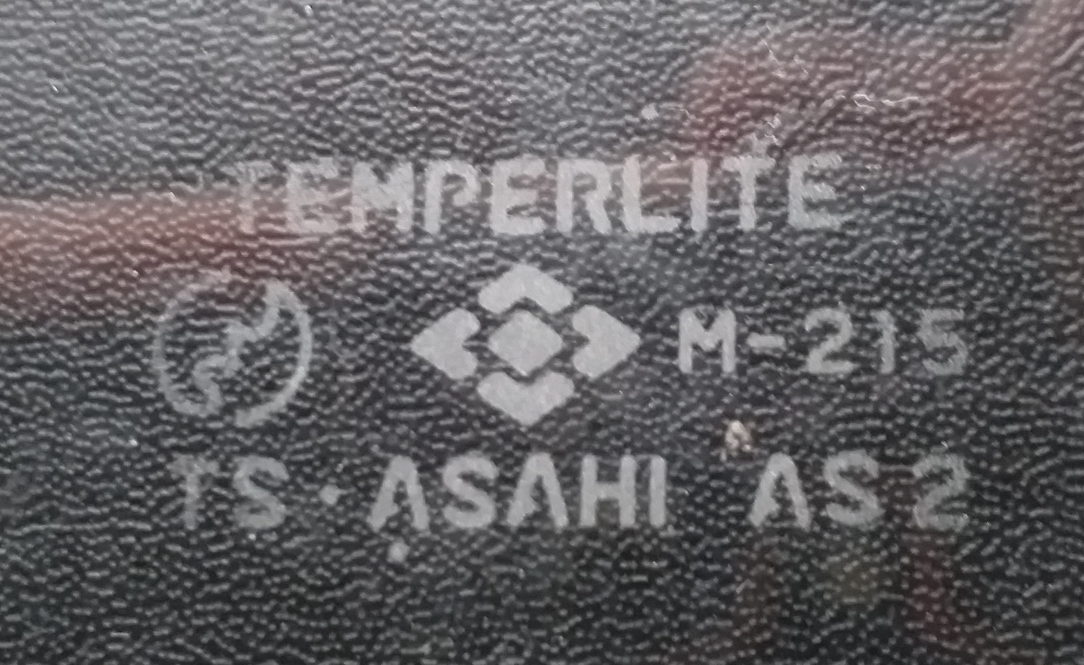 これが私のドアクォーターガラスです(下)。 「ASAHI」と「TEMPERLITE」の周りの小さなドットに注目してください。 これは、ガラスが何年何月に作られたかを示すものです。 CSPが日産製だった頃は絞りきれませんが、自動車以前にガラスが製造されていたに違いありません。