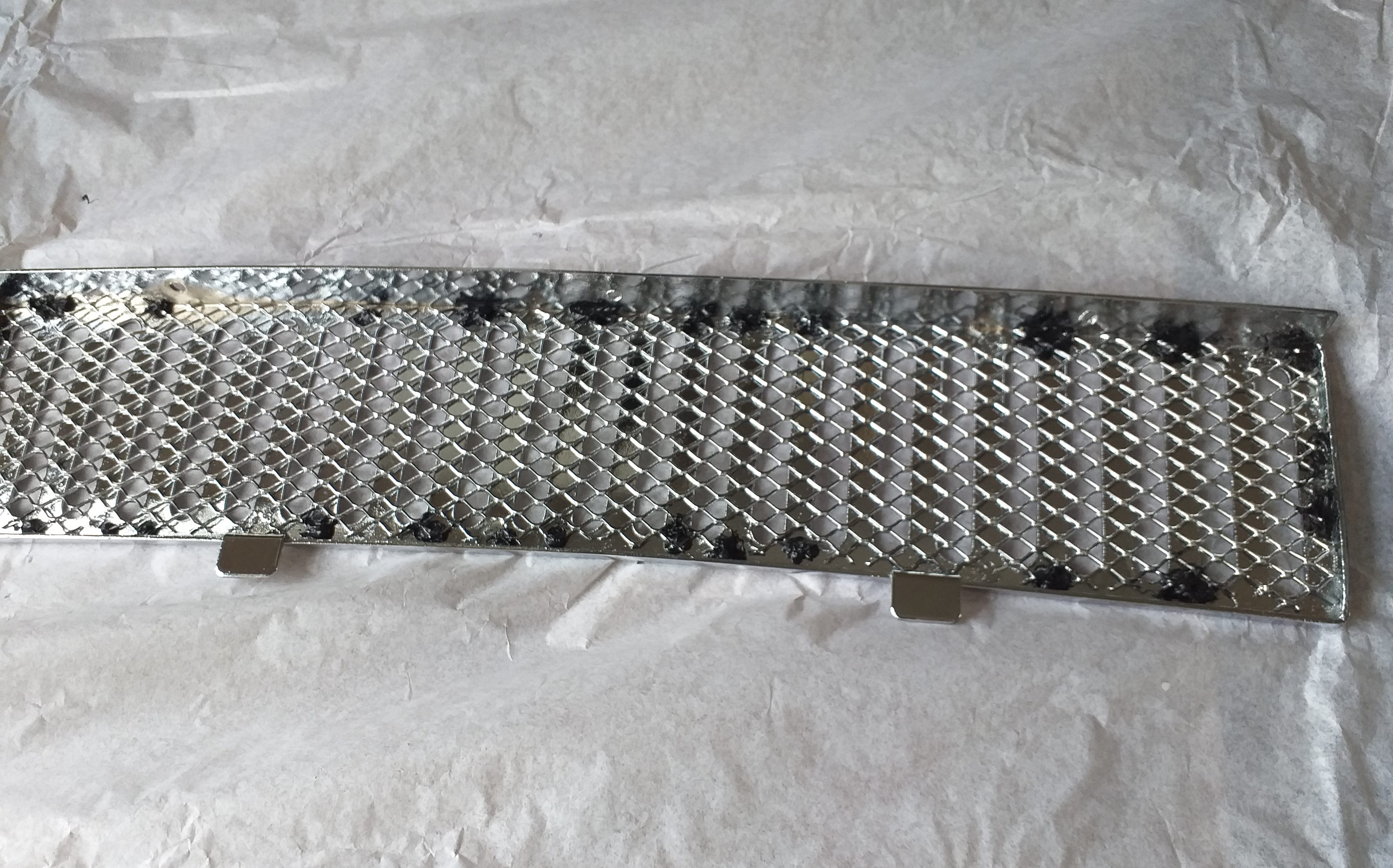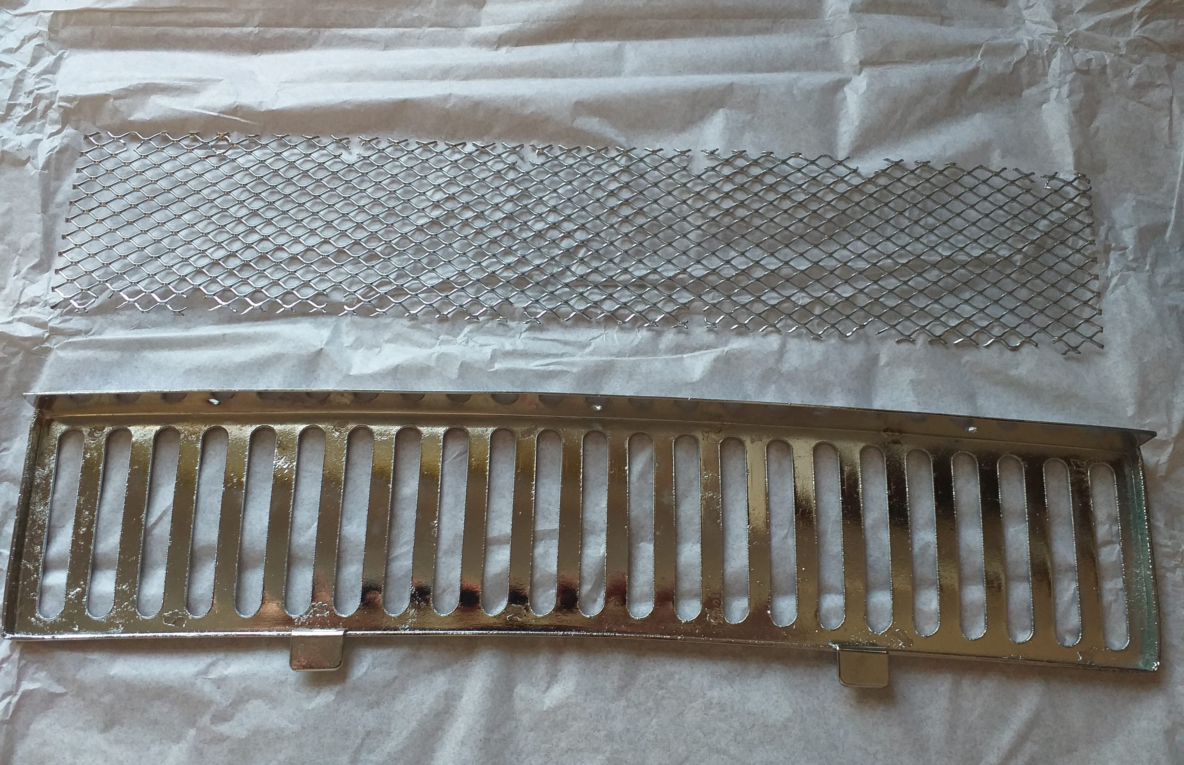 The grille in front of the windscreen, as you see earlier in the blog, was taken apart so that both parts could be chromed well. After along time, I got round to putting these two parts back together. Originally, they were spot welded together, here I used a good silicon adhesive, for exterior use. Many small blobs of adhesive, and then plenty of holding together with clamps for a good fit.