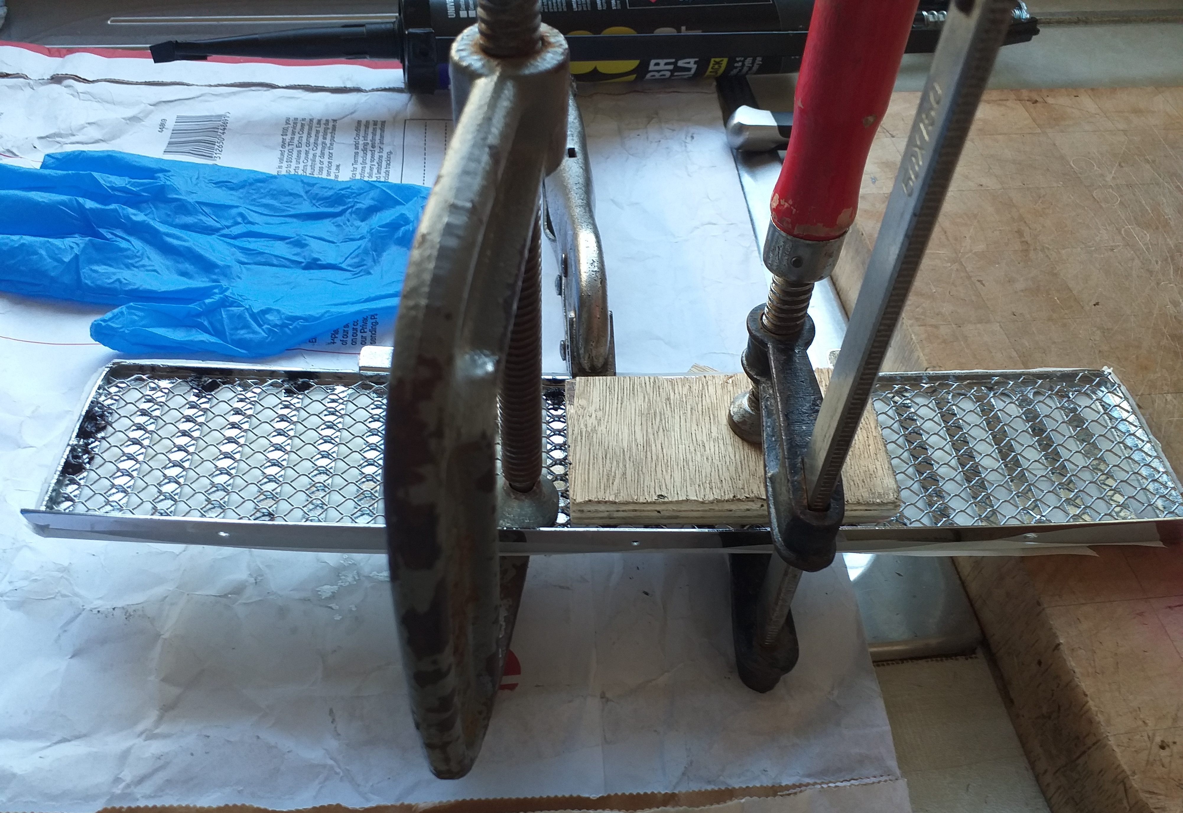 このブログの冒頭でご覧いただいたように、フロントガラスの前のグリルは、両方のパーツをうまくクロームメッキできるように分解されました。長い時間が経ってから、この 2 つのパーツを再び組み立てることにしました。元々はスポット溶接されていましたが、ここでは外装用の良質のシリコン接着剤を使用しました。接着剤を小さな塊にして、クランプでしっかりと固定して、しっかりとフィットさせました。