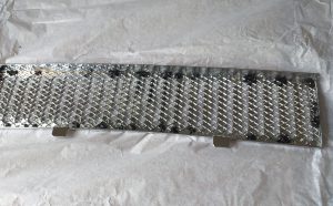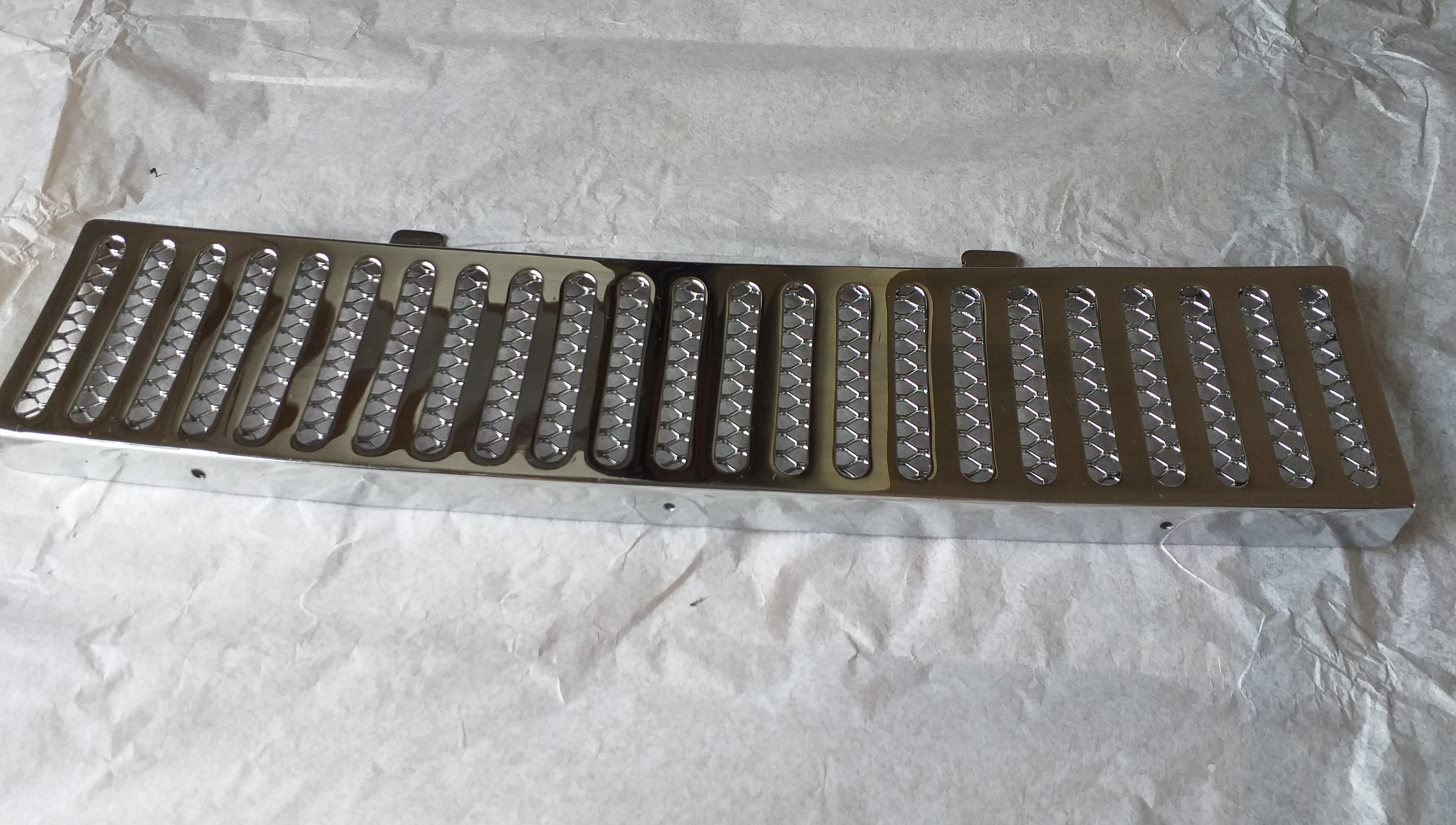 再クロームが必要な部品のコレクションの一部として、CSP311 用の正しいラジオが含まれています。しかし、そのためには薄いアルミ製のフェイシアプレートを取り外す必要があります。これは簡単ではありません。そして、ご覧の通り、どんなに丁寧に作業しても、クロームメッキが終わった後(下の写真)、フェイシアプレートは元に戻すには少し傷みすぎています。