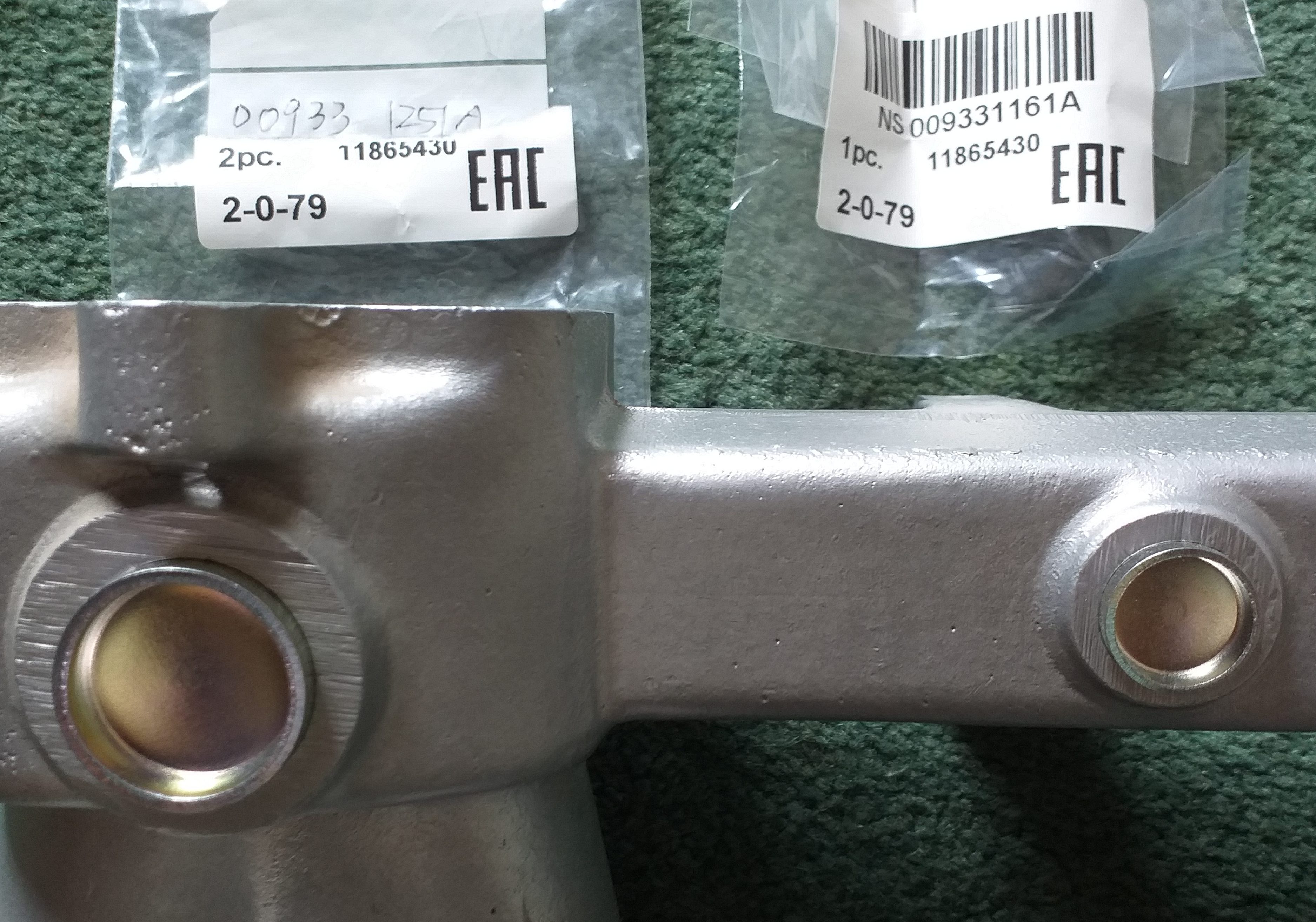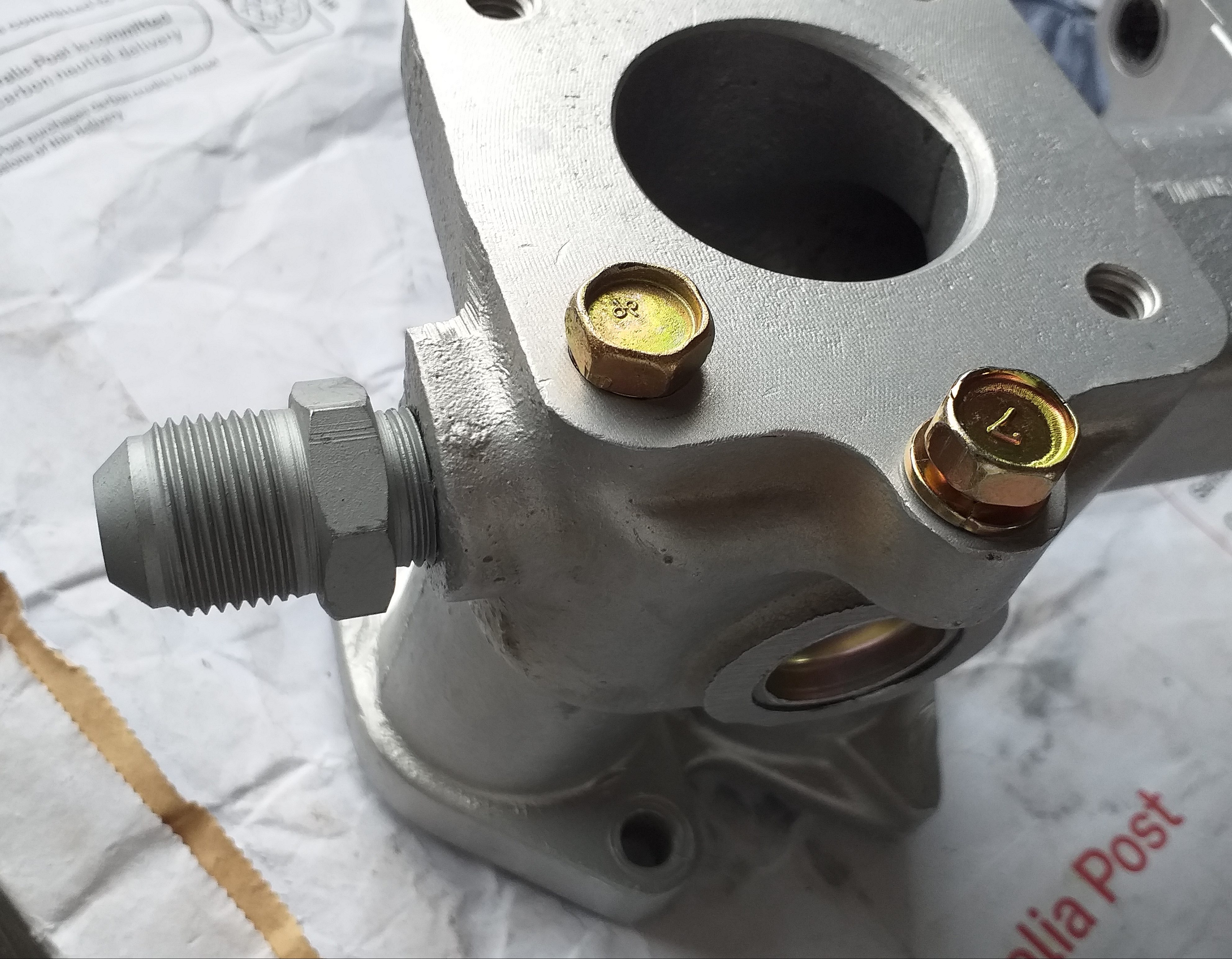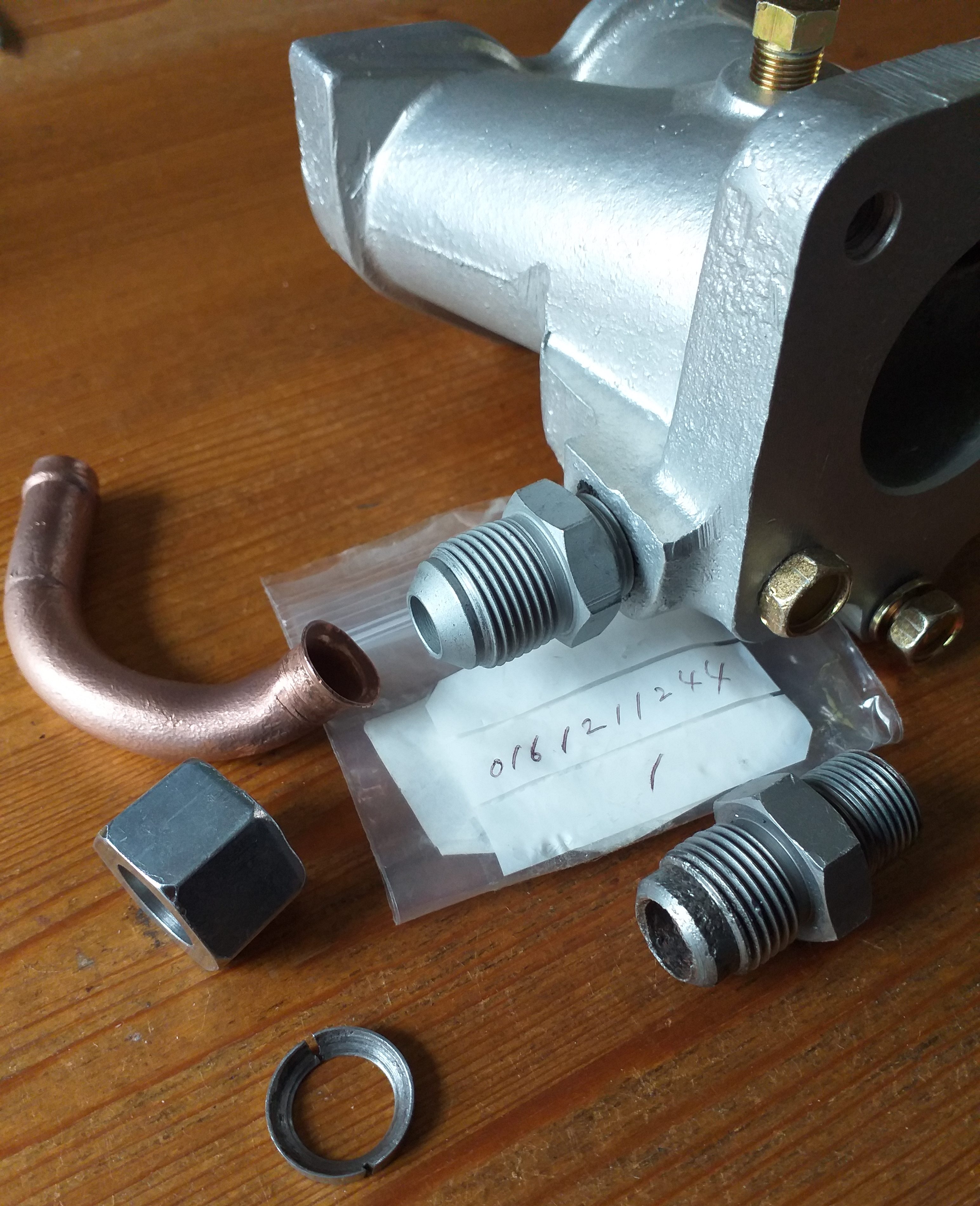 Below image, new manifold fitment attached to manifold (01612-11244) old fitment to right, new nut to left below copper pipe and collet, bottom.
