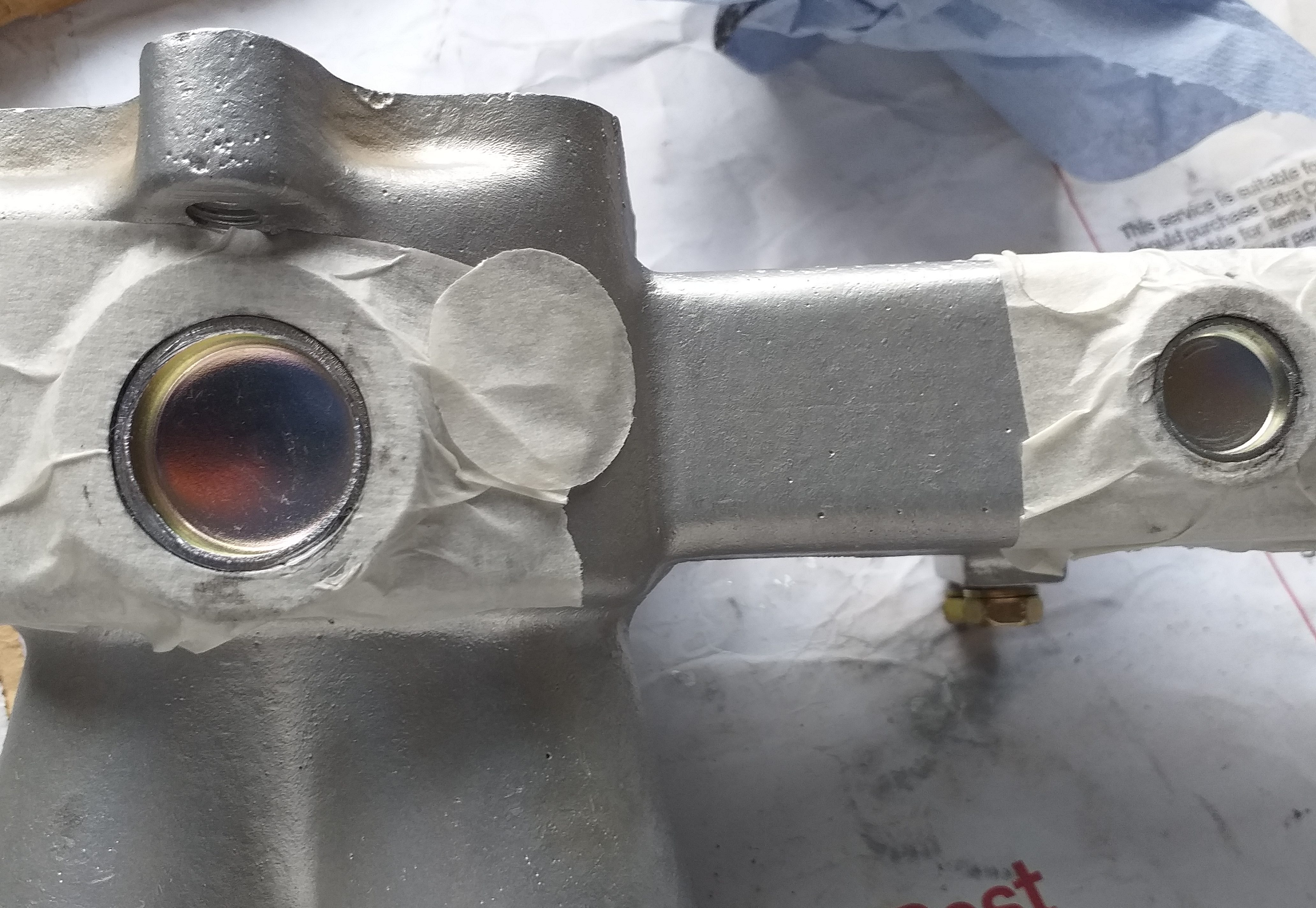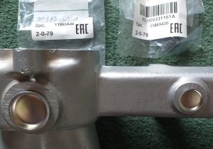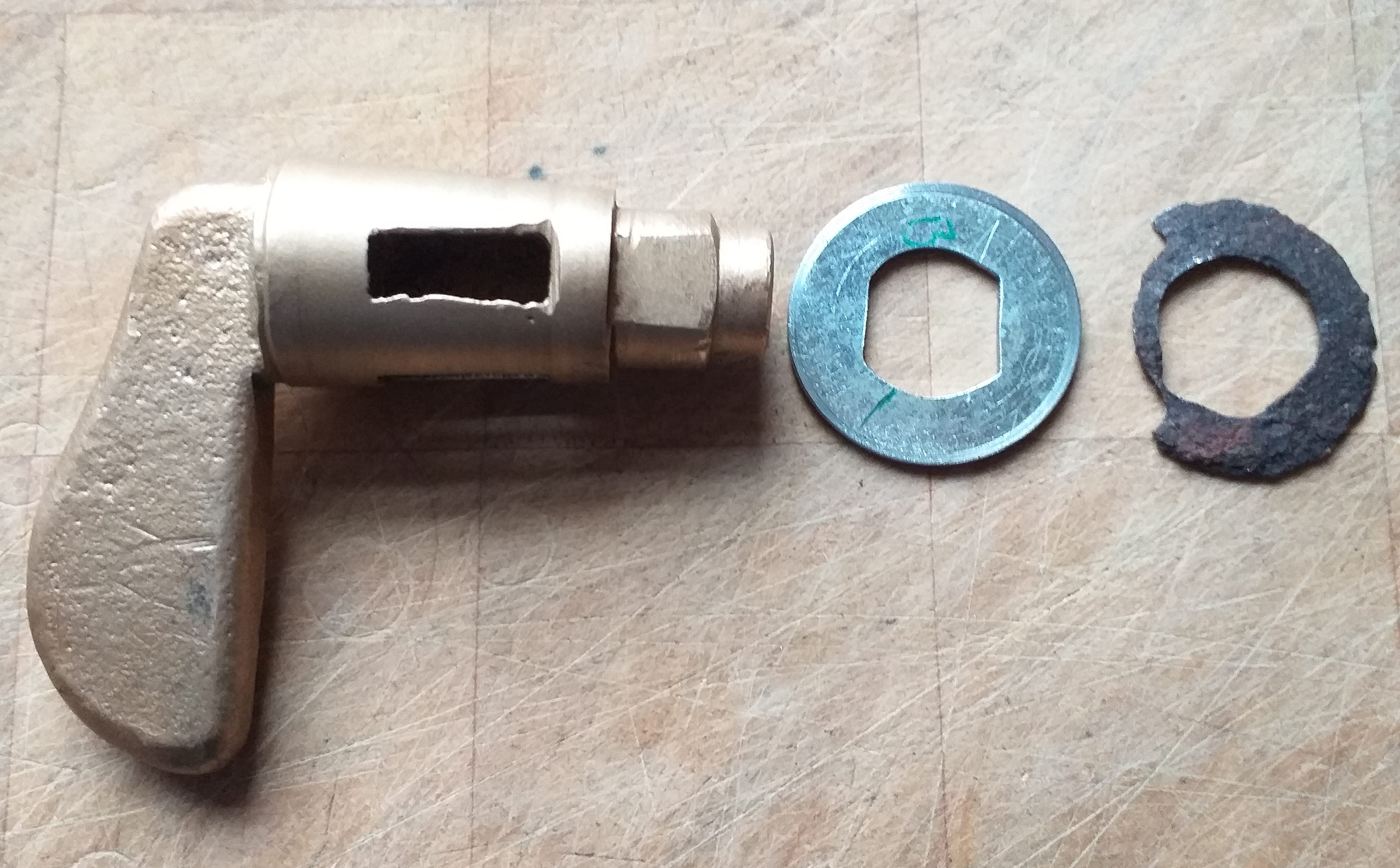 吸気マニホールドの修復を完了するには、冷却水フィッティングの両端に作業が必要でした。後部には真鍮の蛇口があり、これを回して開くと、車内のヒーターに温かい冷却水を送るか、マニホールドの下を迂回させることができます。蛇口は固着していましたが、洗浄とブラスト処理の後、再び機能するようになりました。蛇口は、蛇口と一緒に回転する特殊なワッシャー、スプリング、および別のワッシャーで後ろで固定されています。下の画像 (右側) からわかるように、元のワッシャーが残っています。ほとんどありません! その隣では、新しい特殊なワッシャーの製造が始まっています。