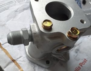At the other end of the inlet manifold is a coolant connector that joins the water pump. Again, mine was corroded and not good enough to use. The correct fitment into the manifold is not available. But Nissan do a new one which is slightly different (01612-11244). The inlet manifold I am using is a later R16 one, so is partly metric, so the -11244 will fit. But, the other end is M20 rather than the original M19 thread size. I had to find a M20 nut with the right thread pitch (1.25), machine it down a little (too long). The inside of the old nut has a conical shape to match the old fitment, but the new one does not. (It is flat). So, I machined the old but to make a “collet” which will seal better around the copper pipe.