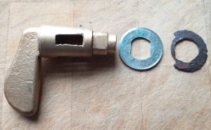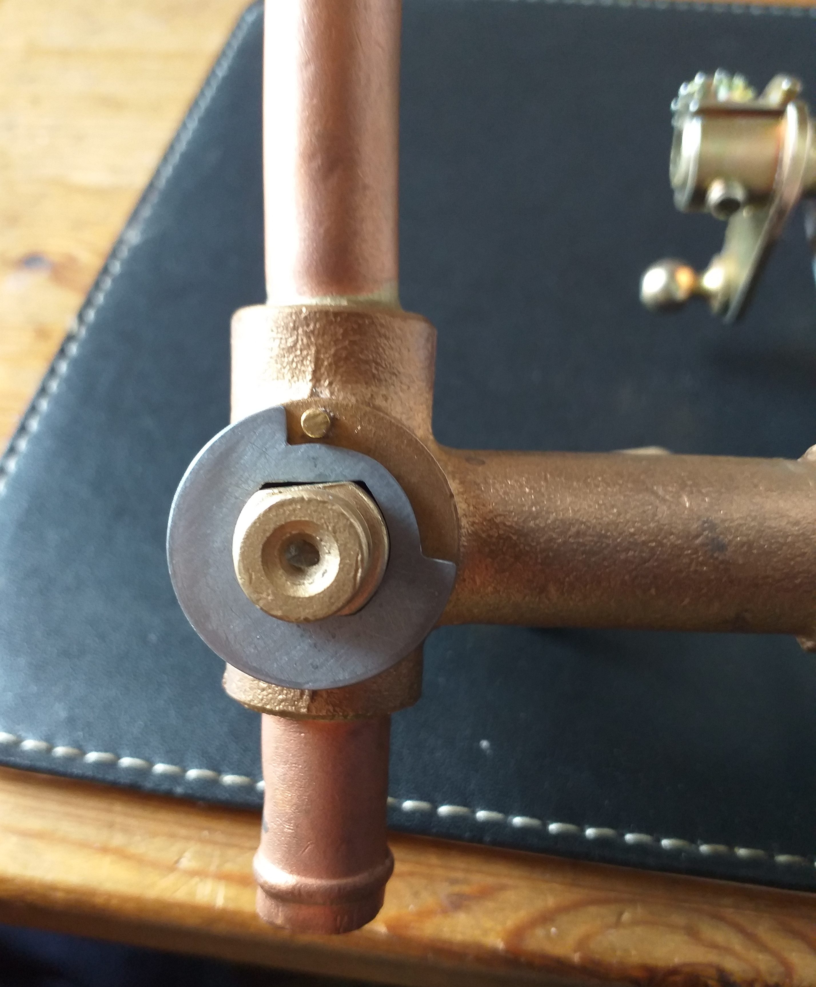 To finish the restoration of the intake manifold both ends of the coolant fittings required work. To the rear is a brass tap that can be turned open to give warm coolant to the heater in the car, or to route round under the manifold. The tap was seized, and after a clean and blast was back to working. The tap is held behind with a special washer (that turns with the tap) a spring and another washer. As you see from the image below (to the right) is what remains of the original washer. Not much! Next to it is the start of the fabrication of a new special washer.