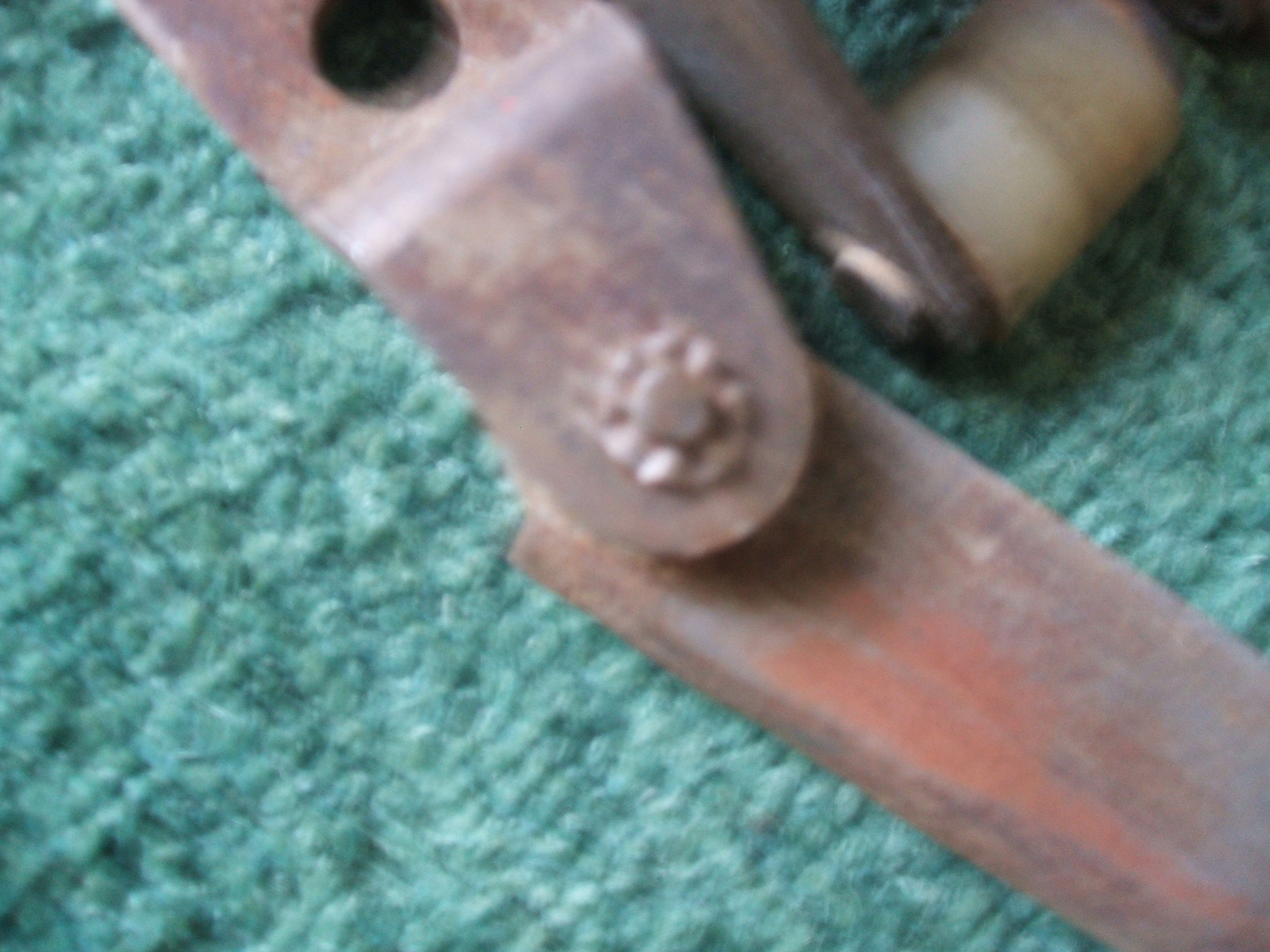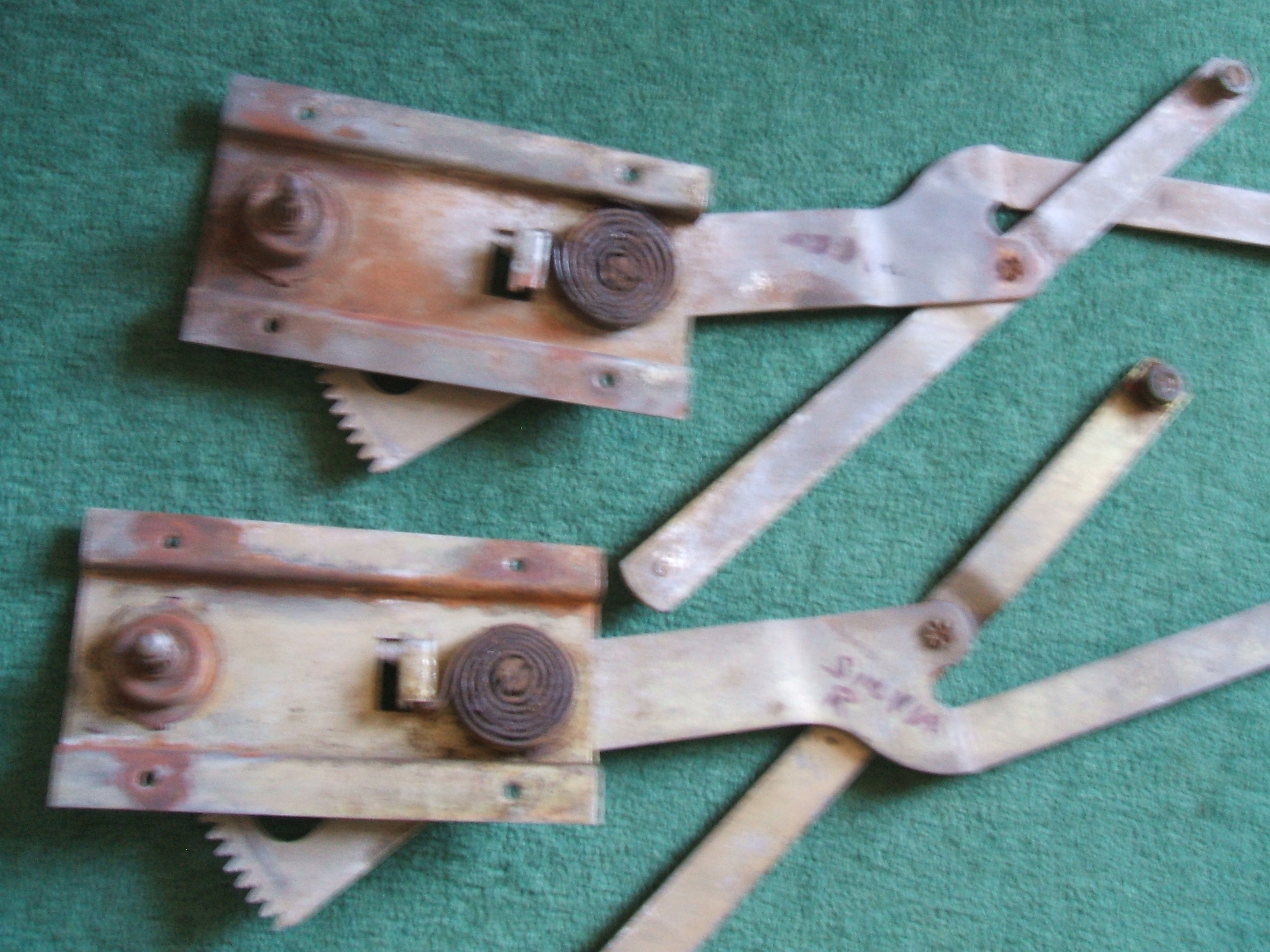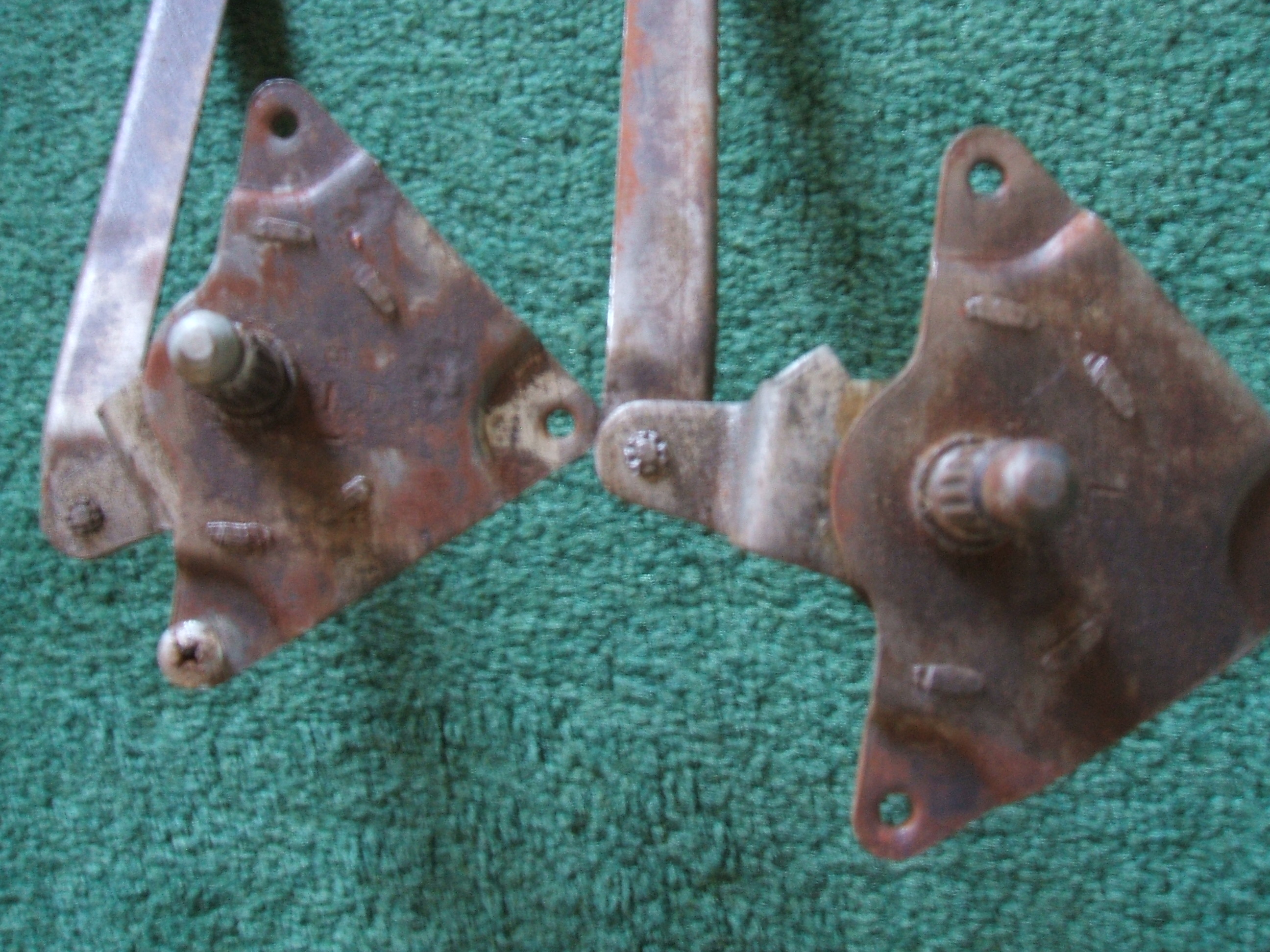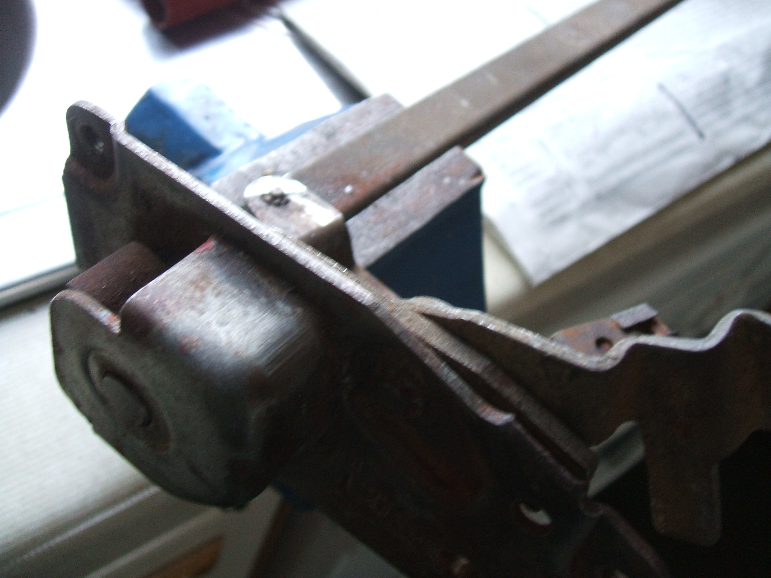 Door latch mechanism getting ready for aqua blasting. Shown against new latch. Rod connecting latch and handle mechanism is pressed together and will need grinding off, and new pivot pin added.