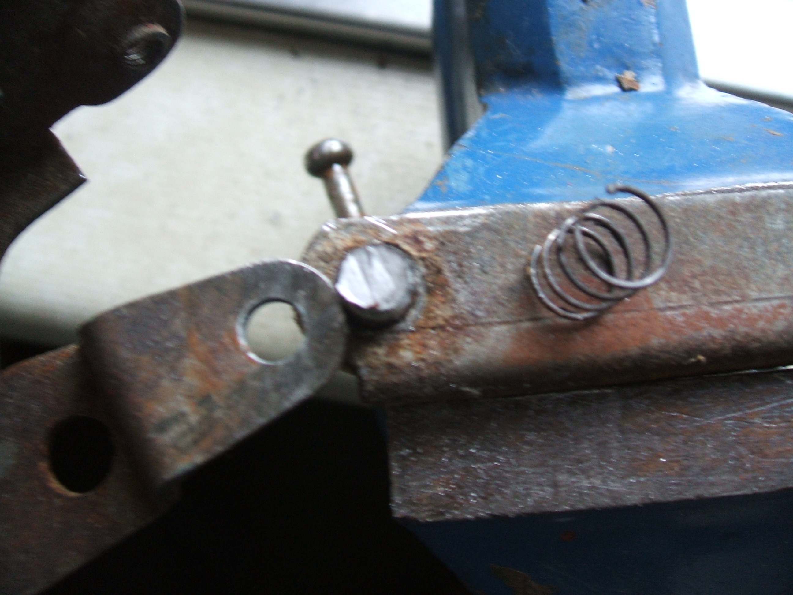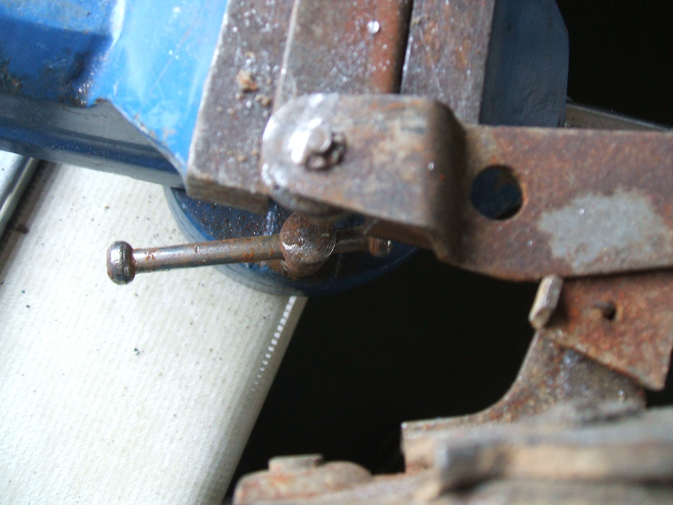 The connecting rod is held onto the door latch mechanism by a pivot pin that has formed a rivet. This has to be removed so a new door latch mechanism can be used, and the rest of the door mechansim can be aqua blasted for plating.