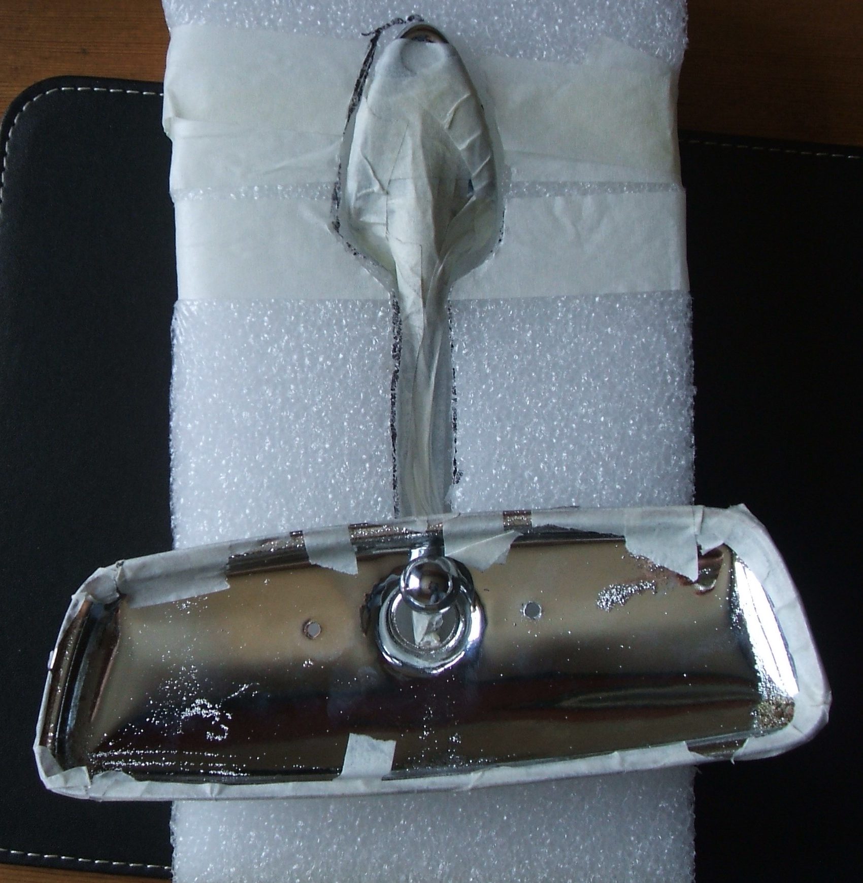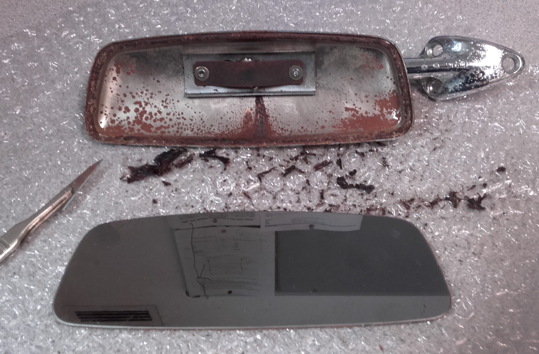 I have restored a Silvia interior mirror. Original condition, chrome pitted, glass light scratches, rust. Restoration starts by carefully removing the original glass. The glass is glued in. It is easily broken. In removing this glass, I chipped the back.