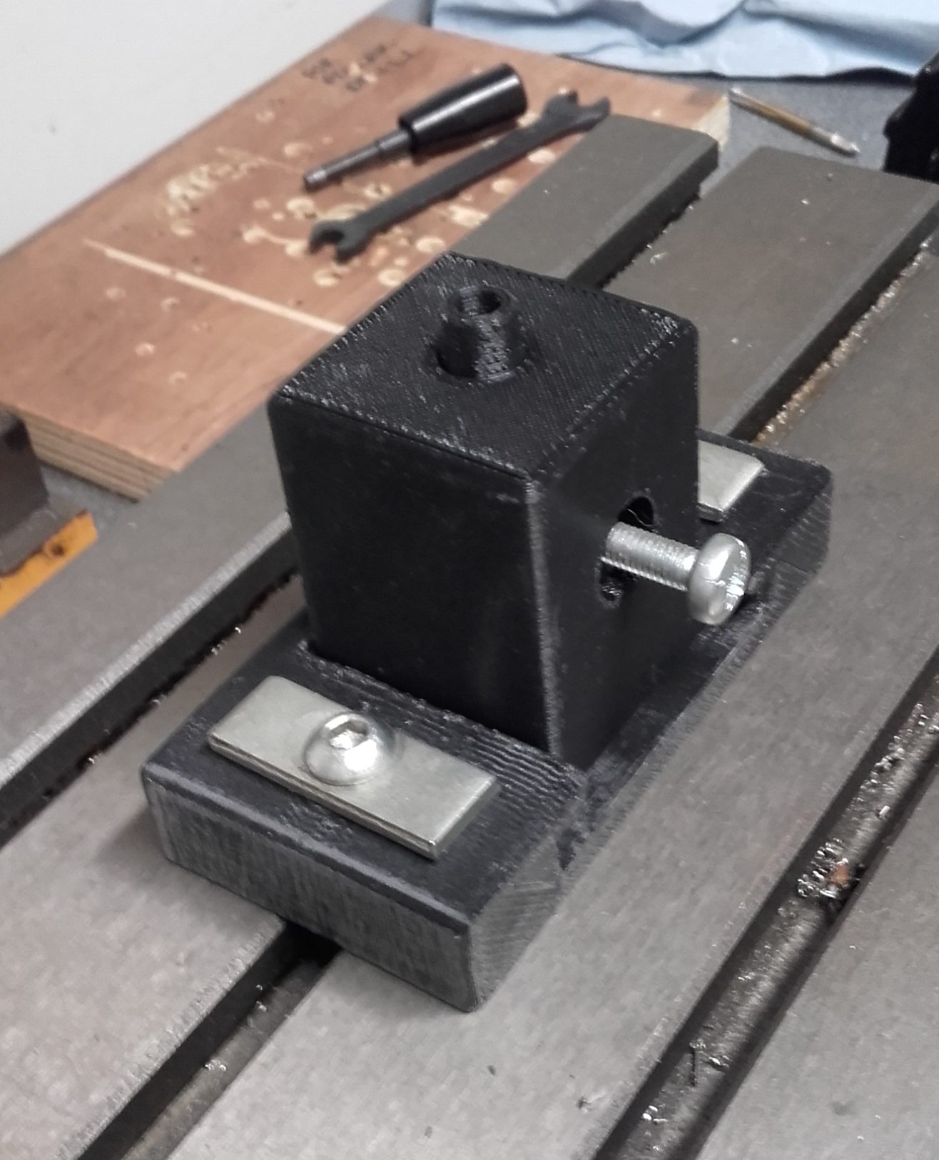 シルビアノブを再現するために、CAD図面を作成してから3D印刷しました。3Dプリントすると、ノブの一部に固定用の穴が付きます。それはまだたくさんの掘削アウト、およびねじり切りが必要です。しかし、私はノブをどのように握ってドリルとねじ切りをするのでしょうか?私は特にこれのために作られたジグが必要です。それで、私は1つを3Dで印刷しました。下の画像から、ジグの一部が穴あけテーブルにボルトで固定され、四角い部分がノブを支えています。四角い部分が出てきます。