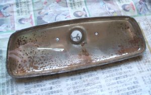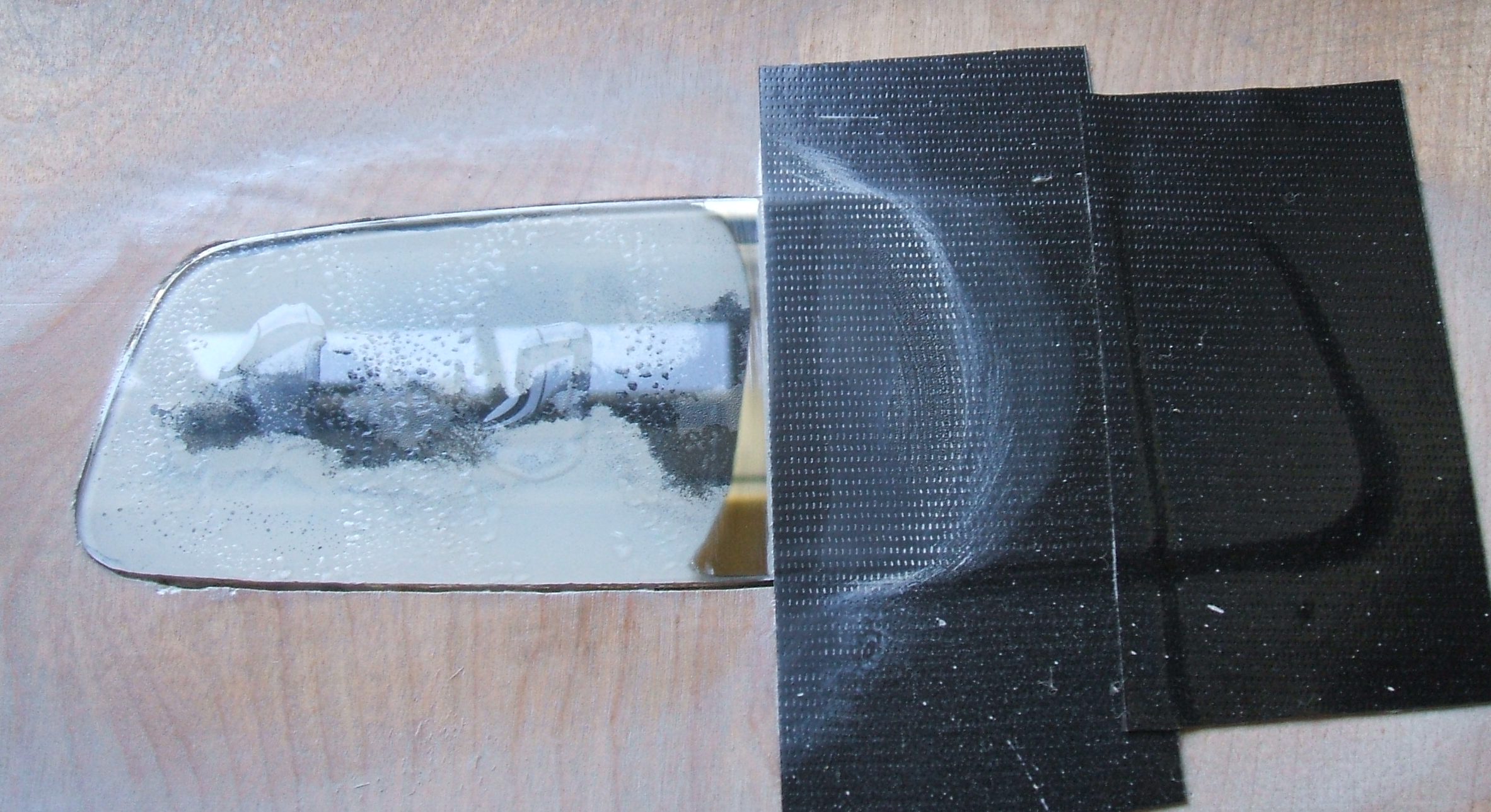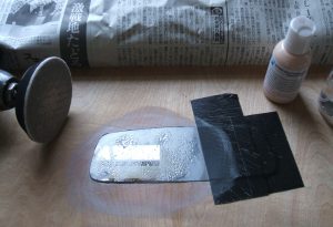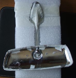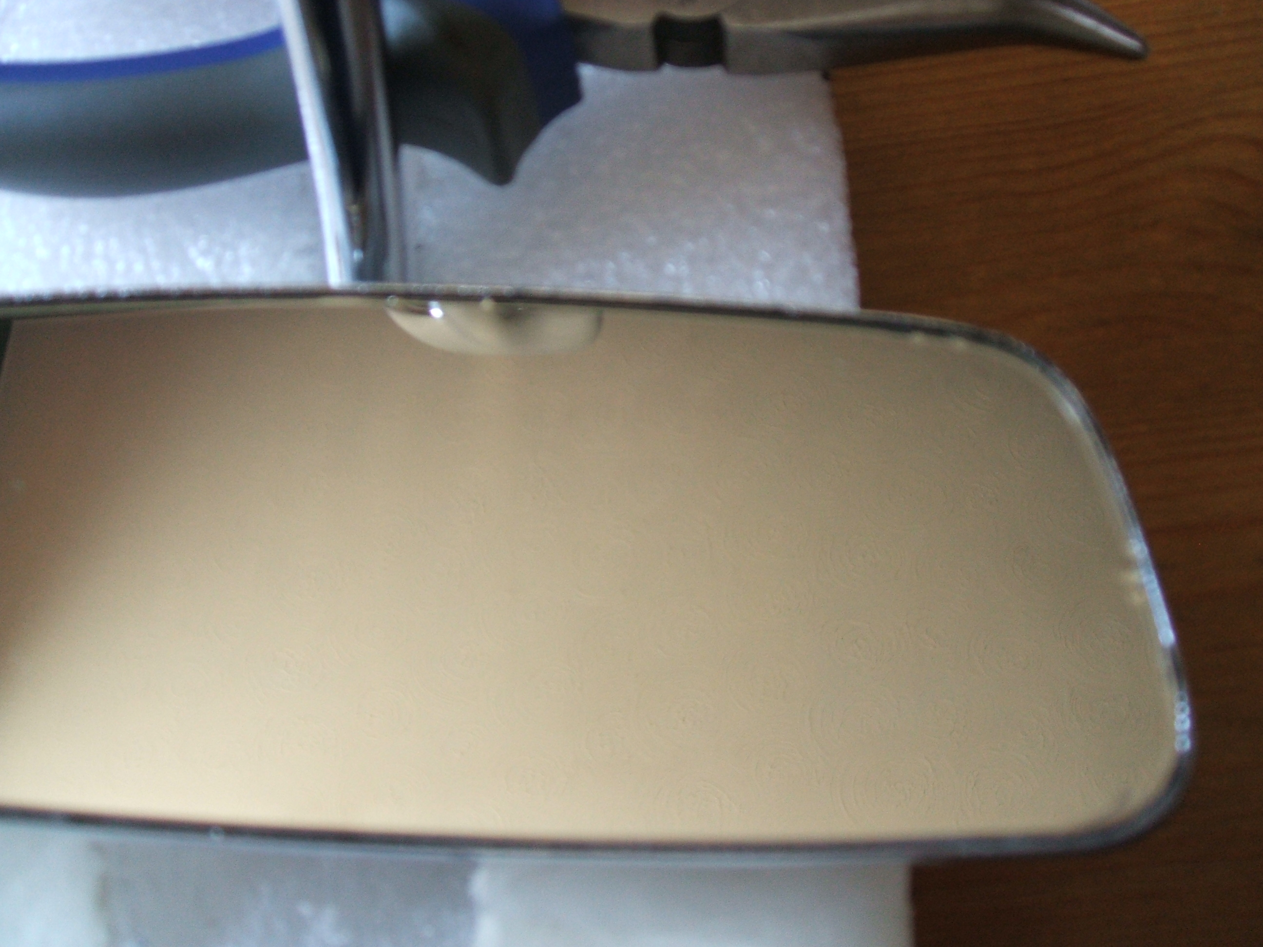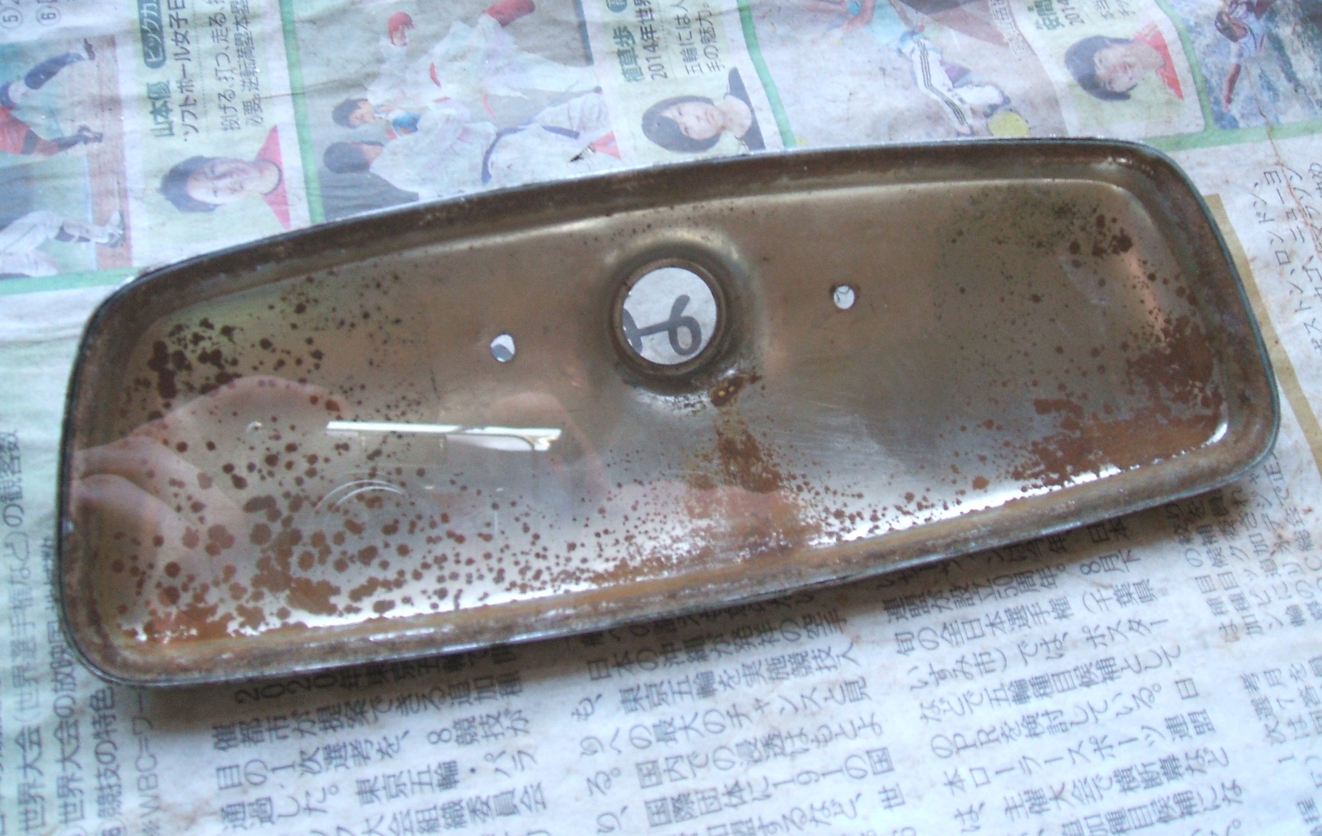私はシルビアインテリアミラーを復元しました。元の状態、クロムピット、ガラスの軽い傷、錆。元のガラスを慎重に取り外すことによって、修復が始まります。ガラスが接着されています。簡単に割れます。このガラスを外すとき、裏側に欠けがありました。