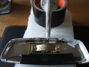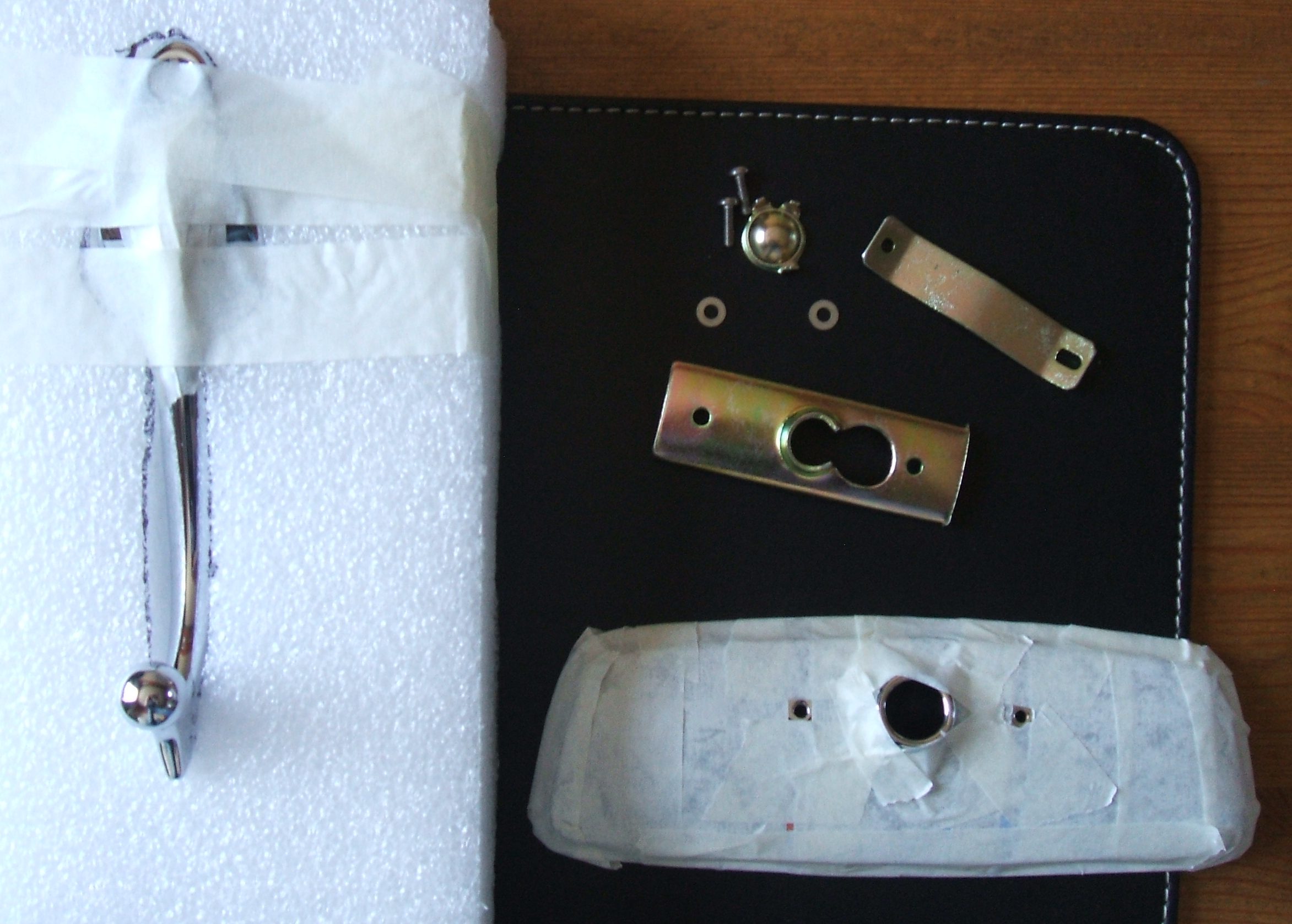 All the parts (except glass) ready for assembly. Masking tape covers the new chrome.