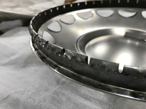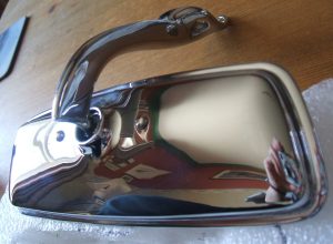 The arm and mirror base was re-chromed. The fixing parts aqua blasted and yellow zinc plated. New rivets were brought. I polished the glass to remove scratches by holding the glass securely in a jig I made.