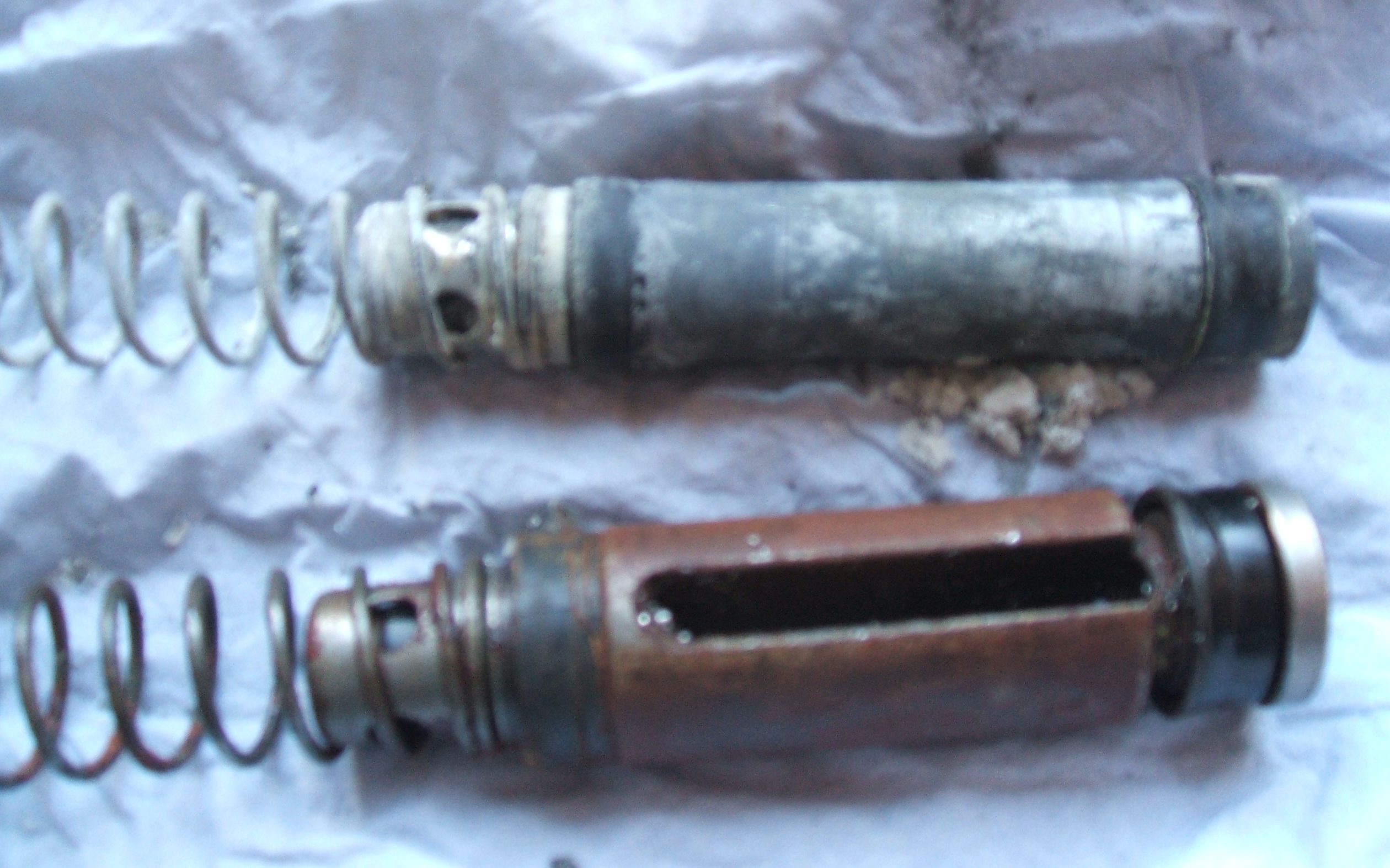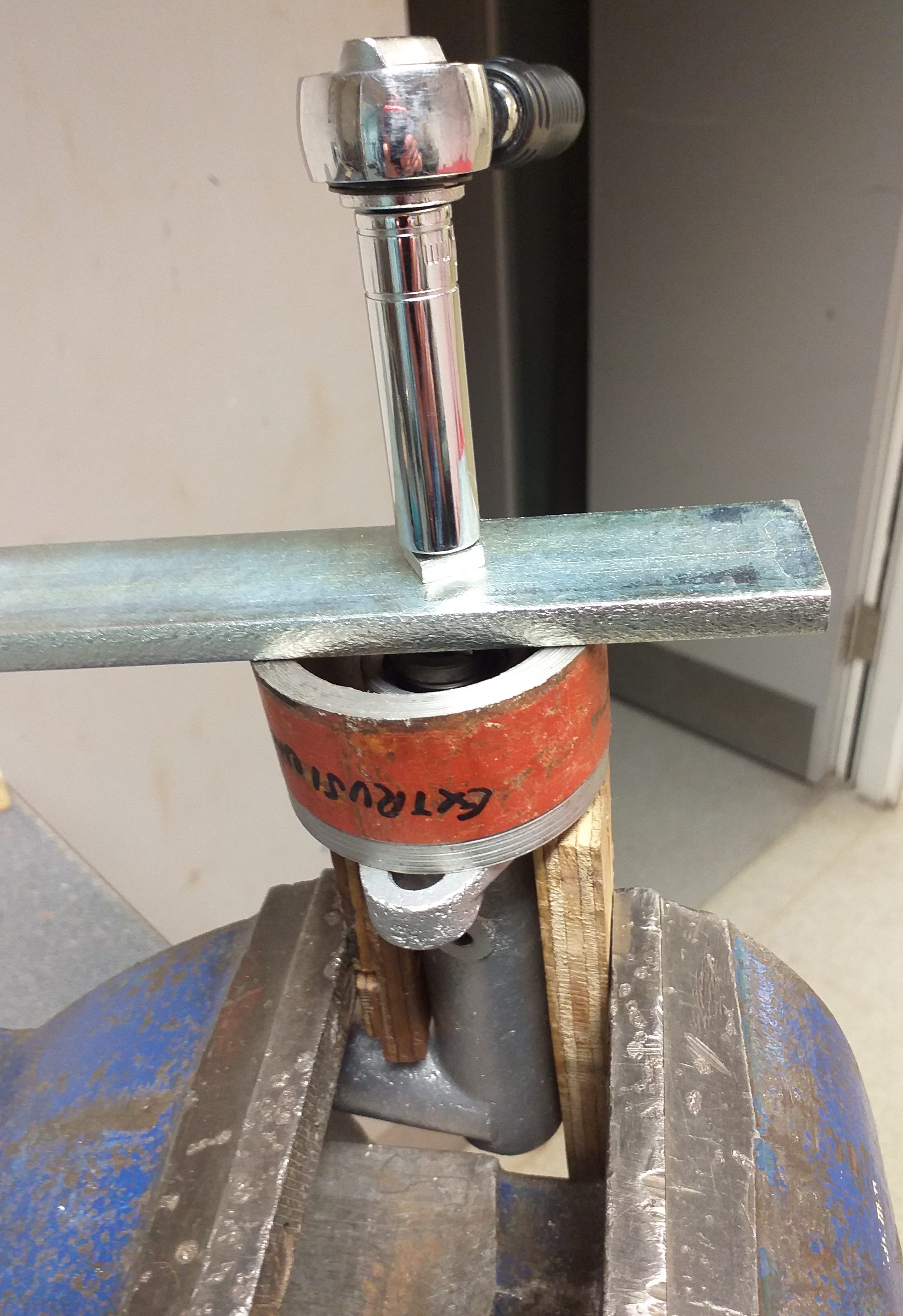 私のクラッチとブレーキの両方のマスターユニットのピストンが内部に詰まっています. それらを取り出す方法。プーラーを作りました。 ピストンをドリルおよびタップします。 ボルト、ナット、スペーサーを追加します。ご覧のとおり、ピストンは外に出たときに良好な状態ではありません。