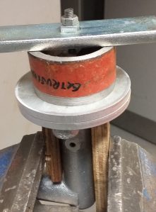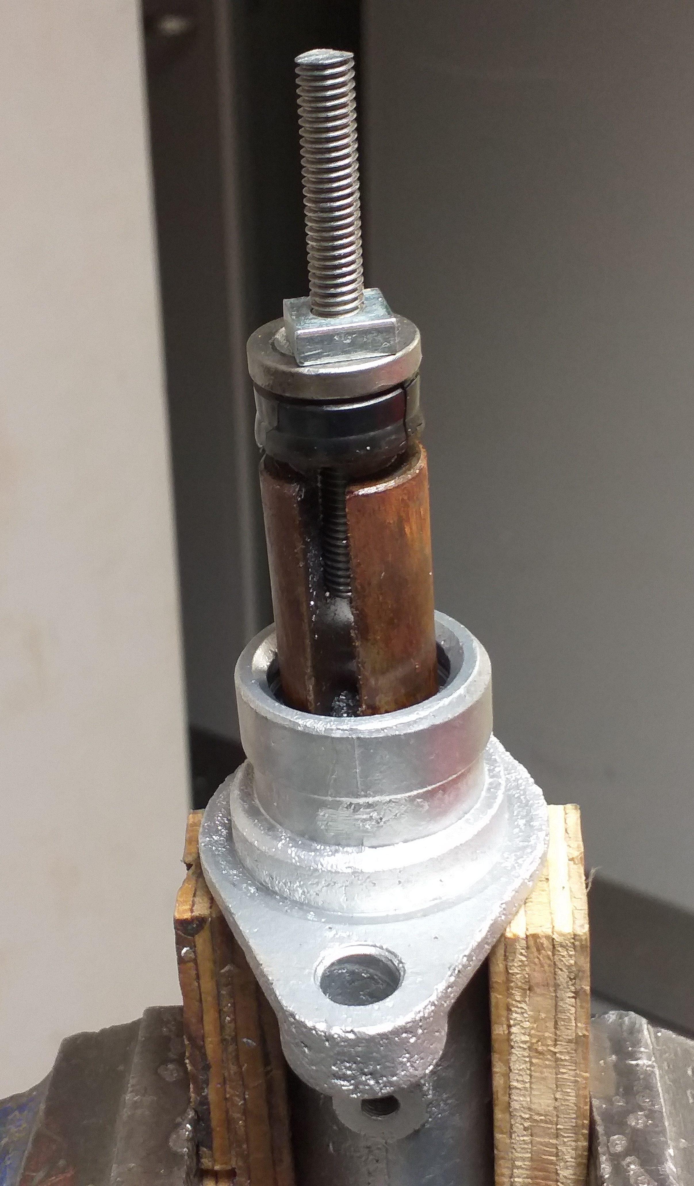 Both my clutch and brake master units have the piston stuck inside. How to get them out. I made a puller. Drill and tap piston. Add bolt, nuts and spacers. As you can see, piston not in good condition when out.