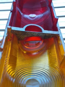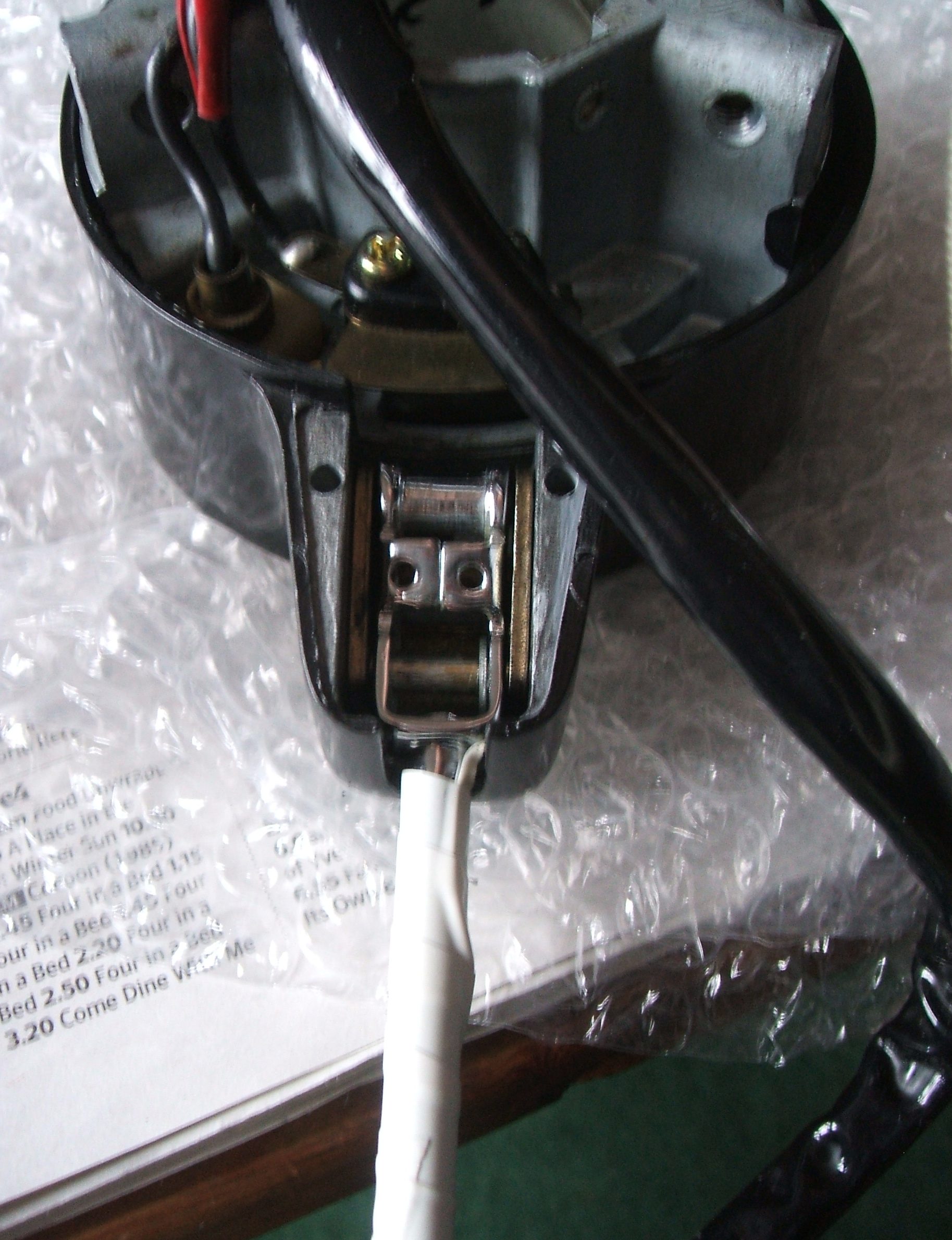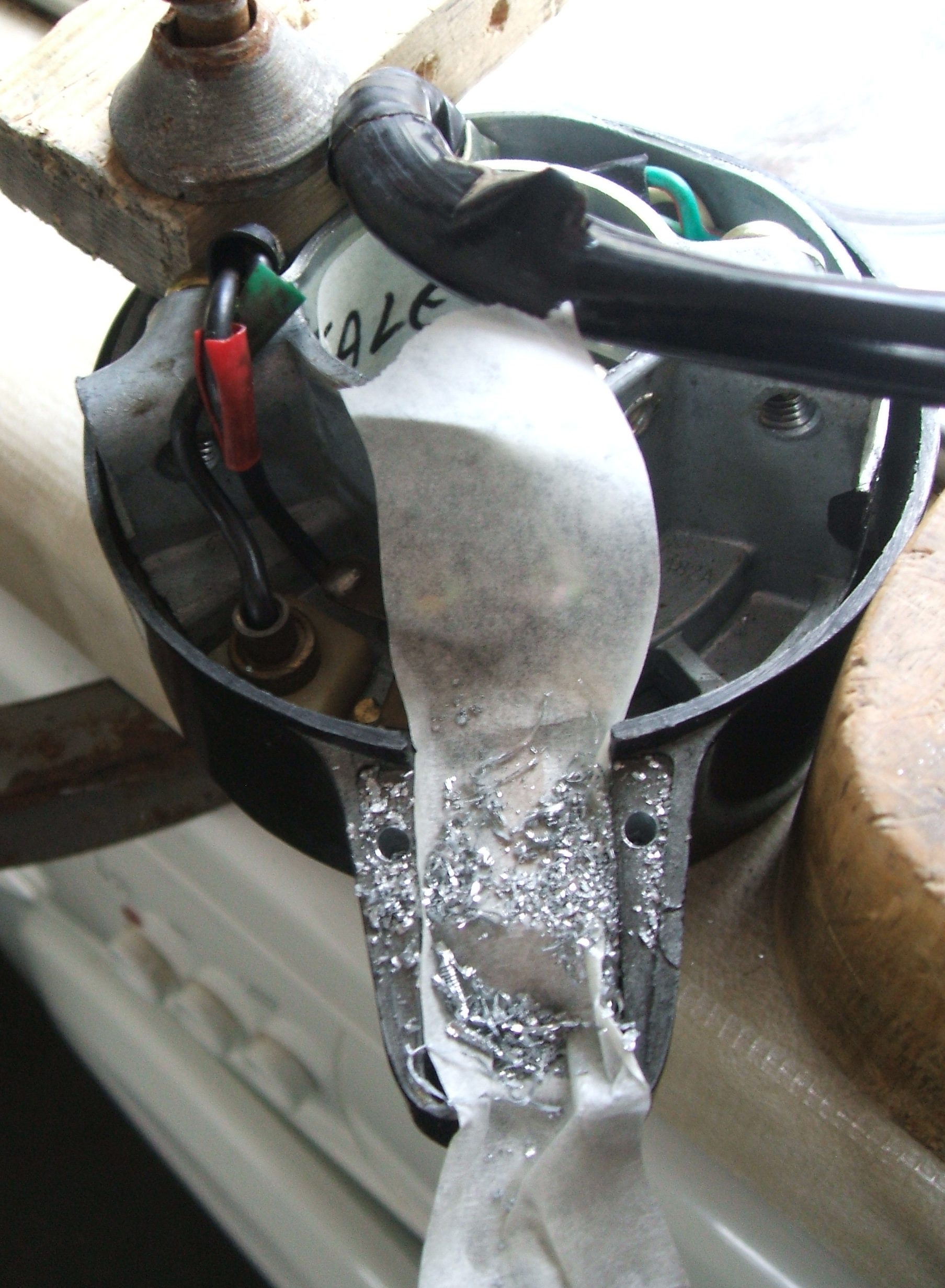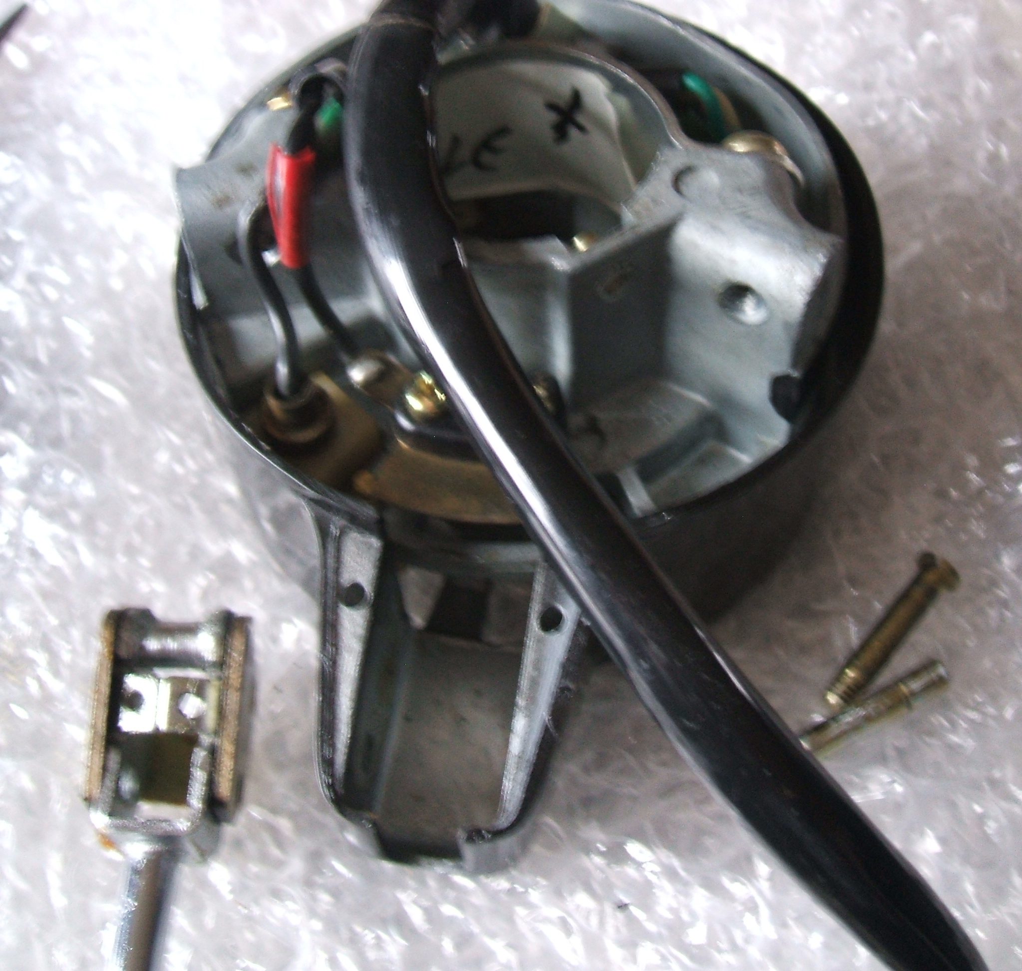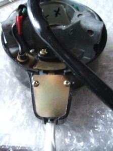 A small job. Within the rear light lens, there is a little metal plate. This plate stops the light from one side lighting up the other. I am missing one. So, let me make another. Here is the plate in the lens.