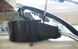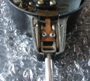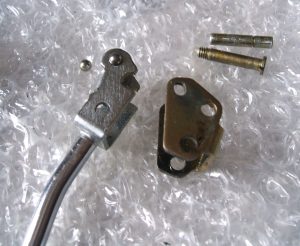 After letting dry, the next job is change the stalk. I have newly chromed Silvia stalk to add. Also, on blog page 8, I show making new knob for stalk. Remove copper tongue from stalk. Next, remove pin on end. This held by “E” clip on the inside. This pin is the pivot for the stalk. Next, un-screw the other pin. This one acts as a stop. The stalk can be removed.