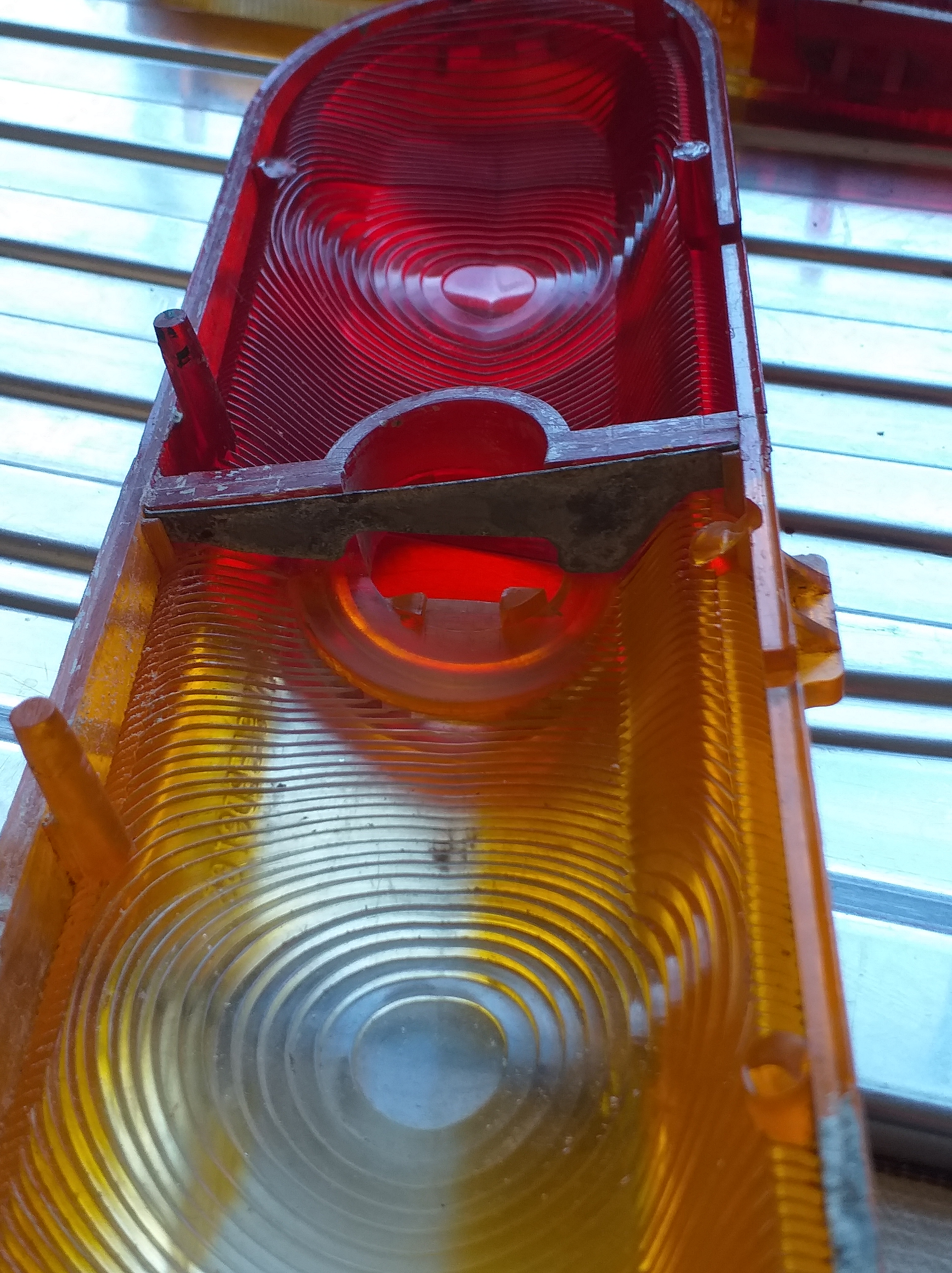 小さな仕事。リアライトレンズ内には、小さな金属プレートがあります。このプレートは、片側からの光がもう片方を照らすのを防ぎます。私は1つが欠けています。だから、もう一つ作りましょう。ここでレンズにおける板です。