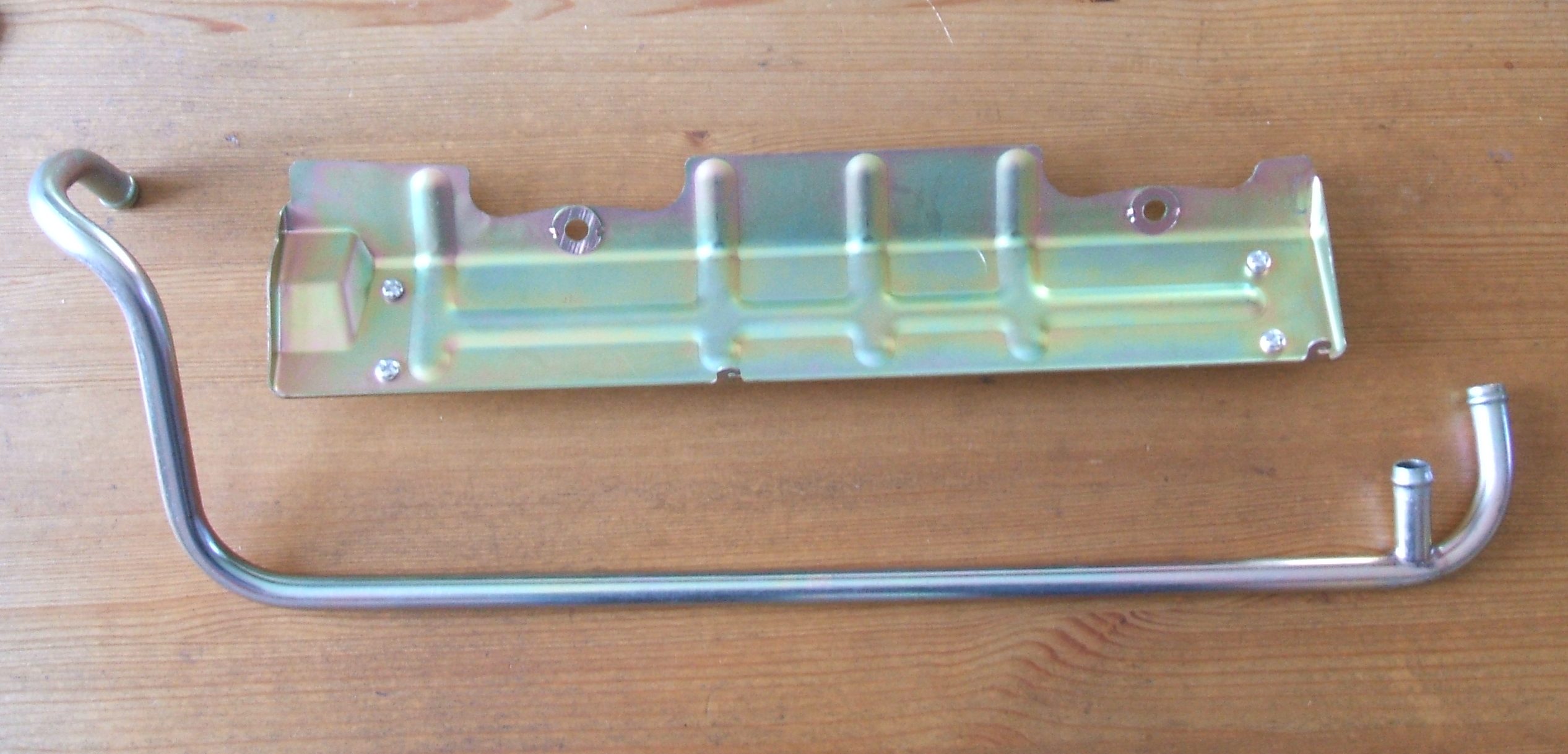 A couple of new parts just arrived. NOS tube manifold to pump (14054-14601) and a new reproduction plate heat shield, carburetor (14330-14600).
