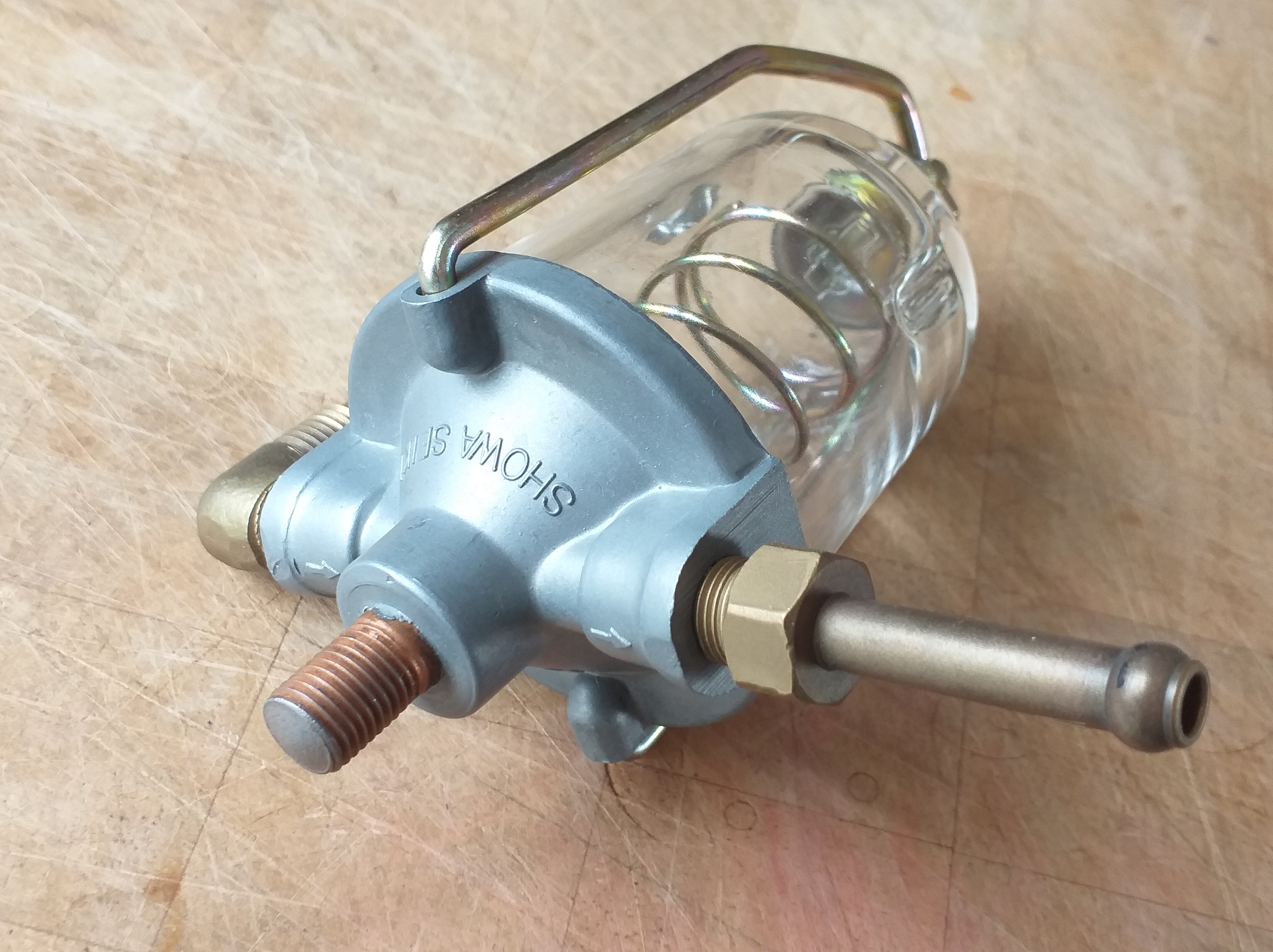 Correct metal and glass fuel filter. This mounts on the radiator cross member. This has been restored by me. Casing blasted with glass media, steel parts new yellow zinc plating. No filter but comes with correct Nissan sealing gasket. £115 excluding shipping