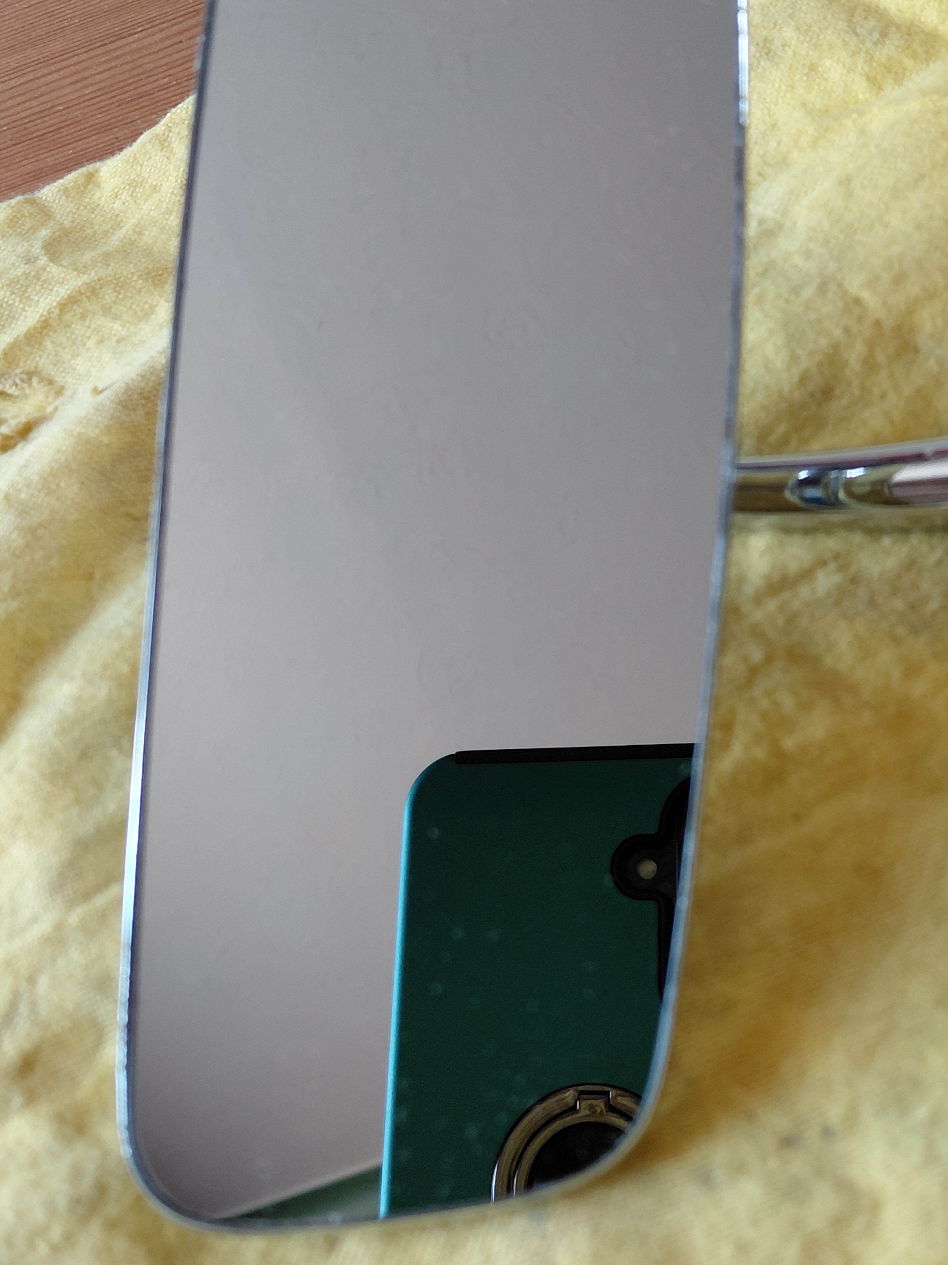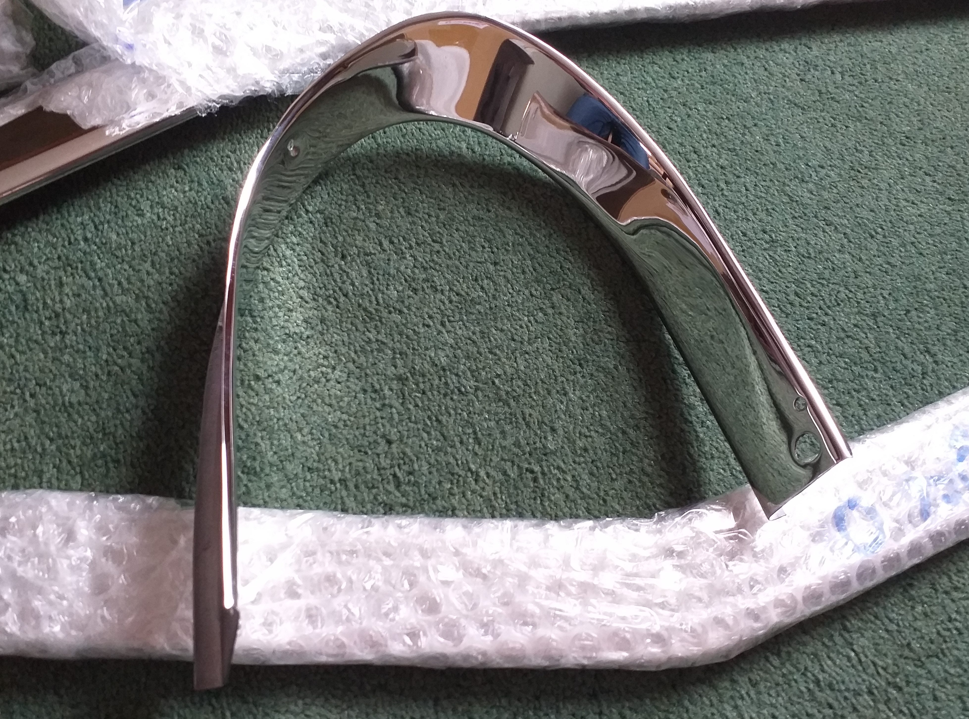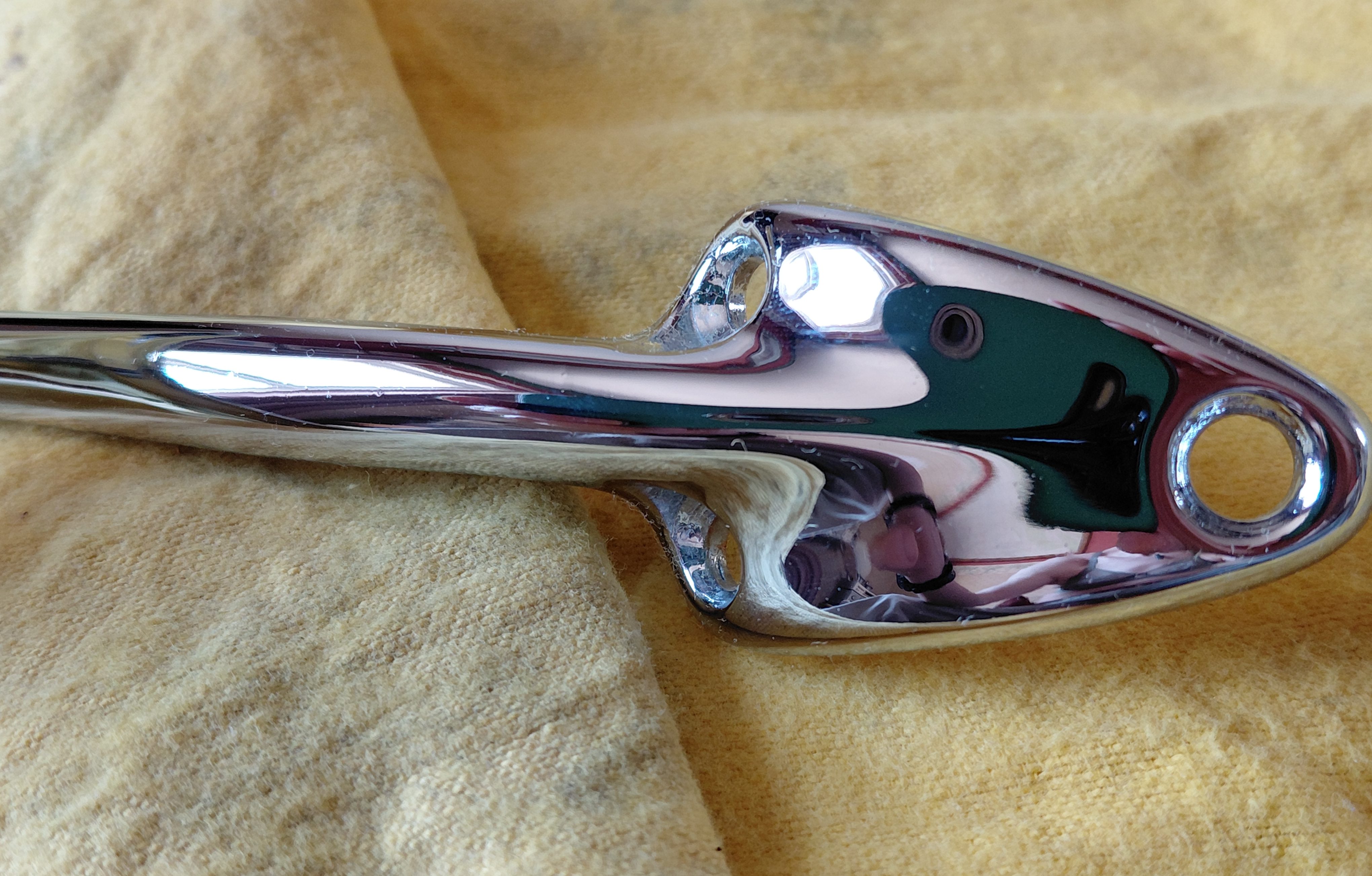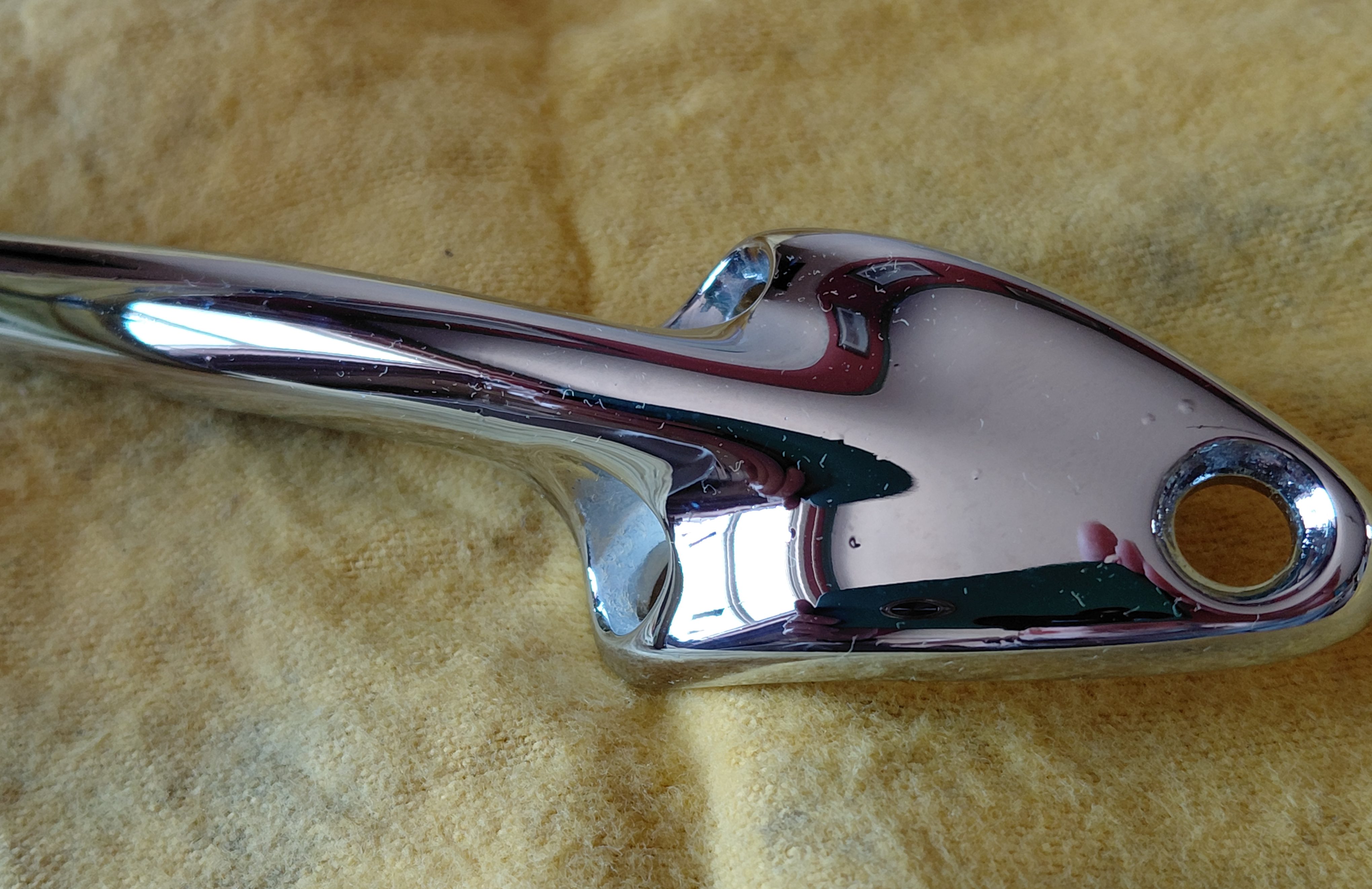 このインテリアミラー(下)は、上のミラーと同じ高い水準で修復されていますが、クロームメッキ工程で生じたザマックの不純物による小さな欠陥(小さな気泡や吹き出物)が、ルーフへの取り付け用3つの固定穴付近のステムにいくつか見られます。これらは軽微でほとんど目立ちません(下の写真で確認できます)。しかし、完璧に近い仕上がりをご希望でしたら、このミラーは適していません。そのため、価格は若干値下げされ、送料を除いて 410 ポンドになります。