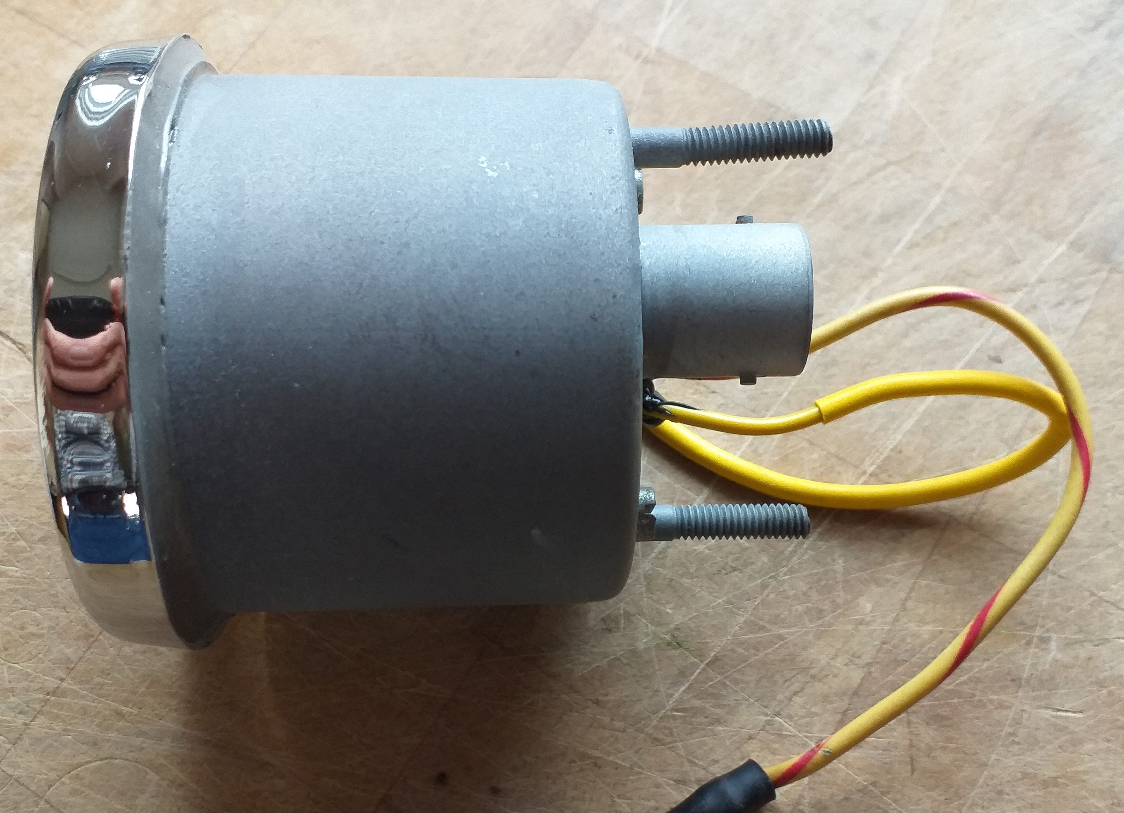 CSP311 または SP311 (初期モデル) に適した、修復された燃料計。これは、空き時間に SP/SR 計器を修復する、ビンテージ航空機計器修復者によって専門的に修復されています。日産が何らかの方法で計器本体の周りにクローム ベゼルを圧着したため、これらの計器を分解するのは困難です。取り外すにはベゼルを持ち上げる必要がありますが、この方法では満足のいく仕上がりにはなりません。ここでは、この計器が治具に取り付けられているため、ベゼルが切断され、計器本体の後ろの部分が取り外されています。特殊なシーラーを使用して、再クローム ベゼルを接着し直します。