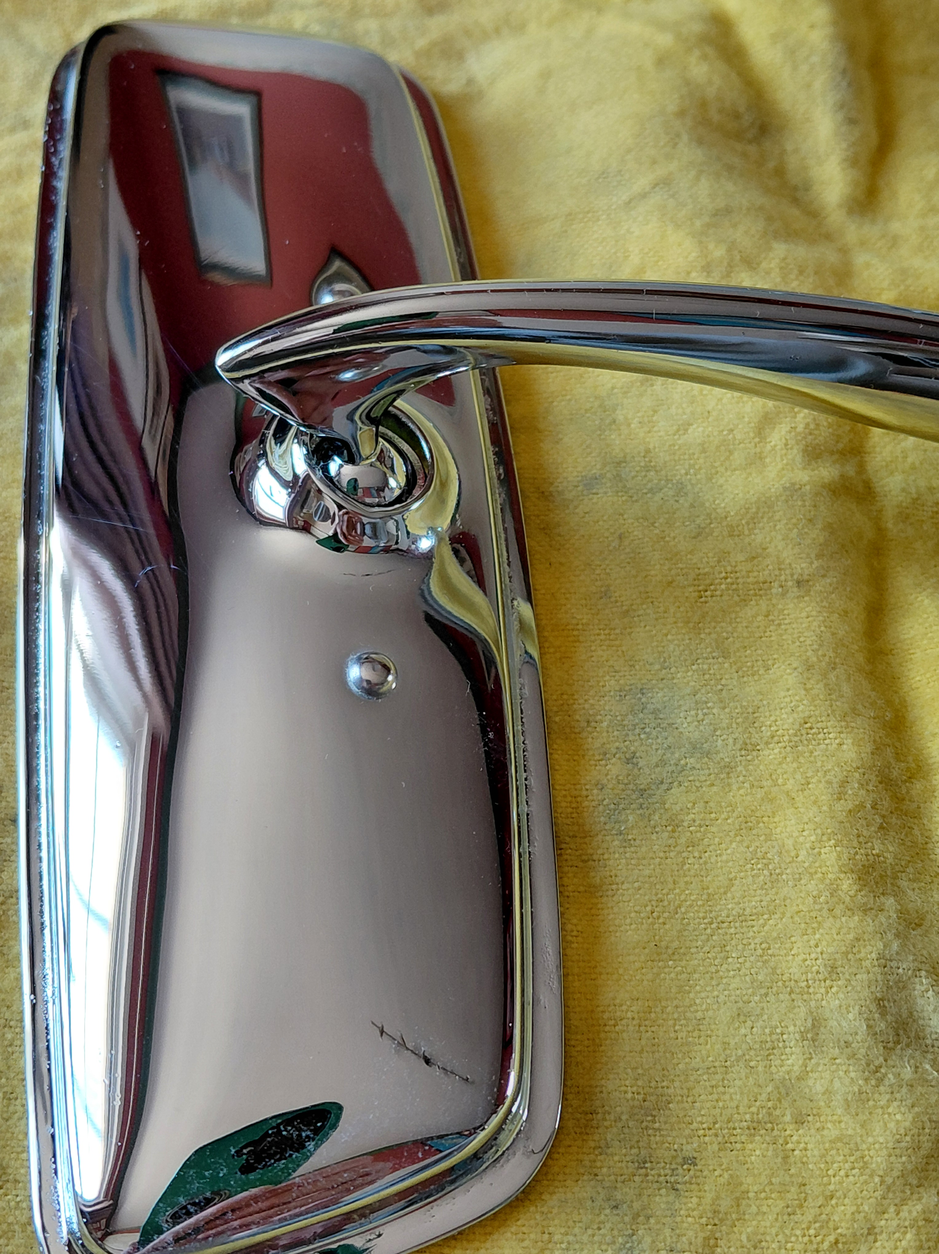 This interior mirror (below) has been restored to the same high standards as the mirror above, but there are a few minor imperfections of impurities within the zamak during the chroming process (little bubbles/pimples) on the stalk near the 3 fixing holes (to attach to the roof). I stress these are minor and hardly noticeable (can you see them in the photo below), but if you are nervous about near perfection, this will not be for you. As such, the price is slightly reduced, £410 excluding shipping.As such, the price is slightly reduced, £410 excluding shipping.