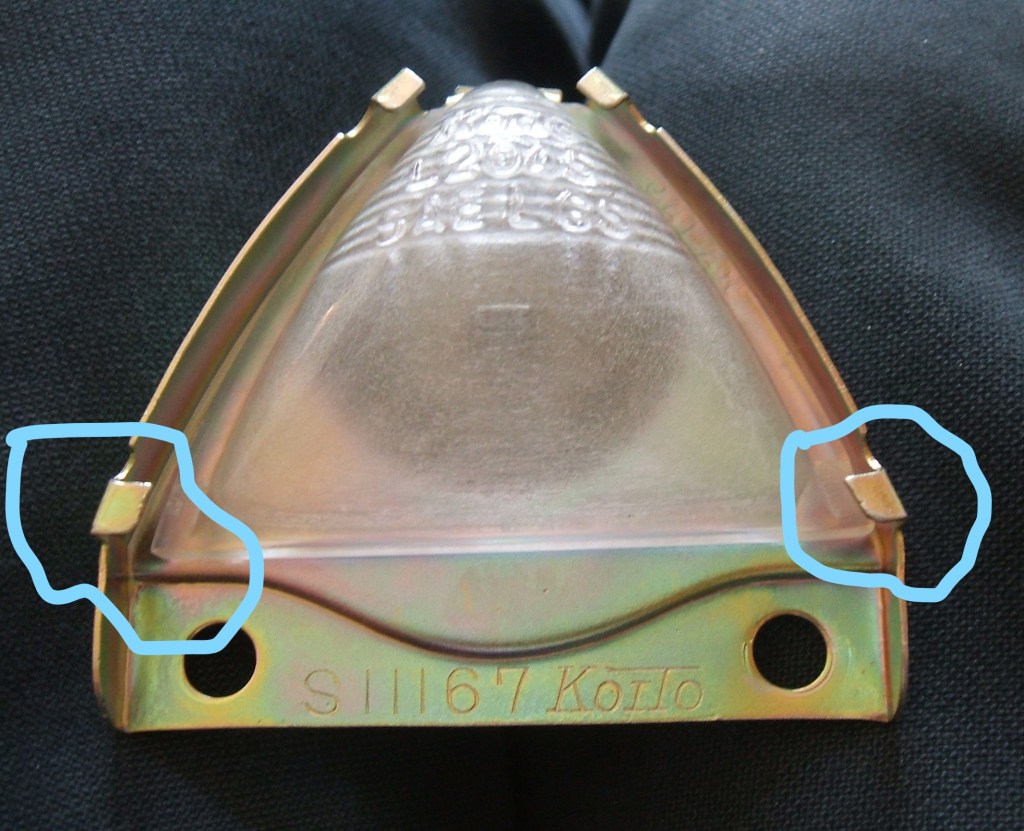 This lens has has a wider flat border around the domed section above the light bulb. Also, the metal lamp base does not have these tabs (below) which can be used to hold the lens in place in a later design.